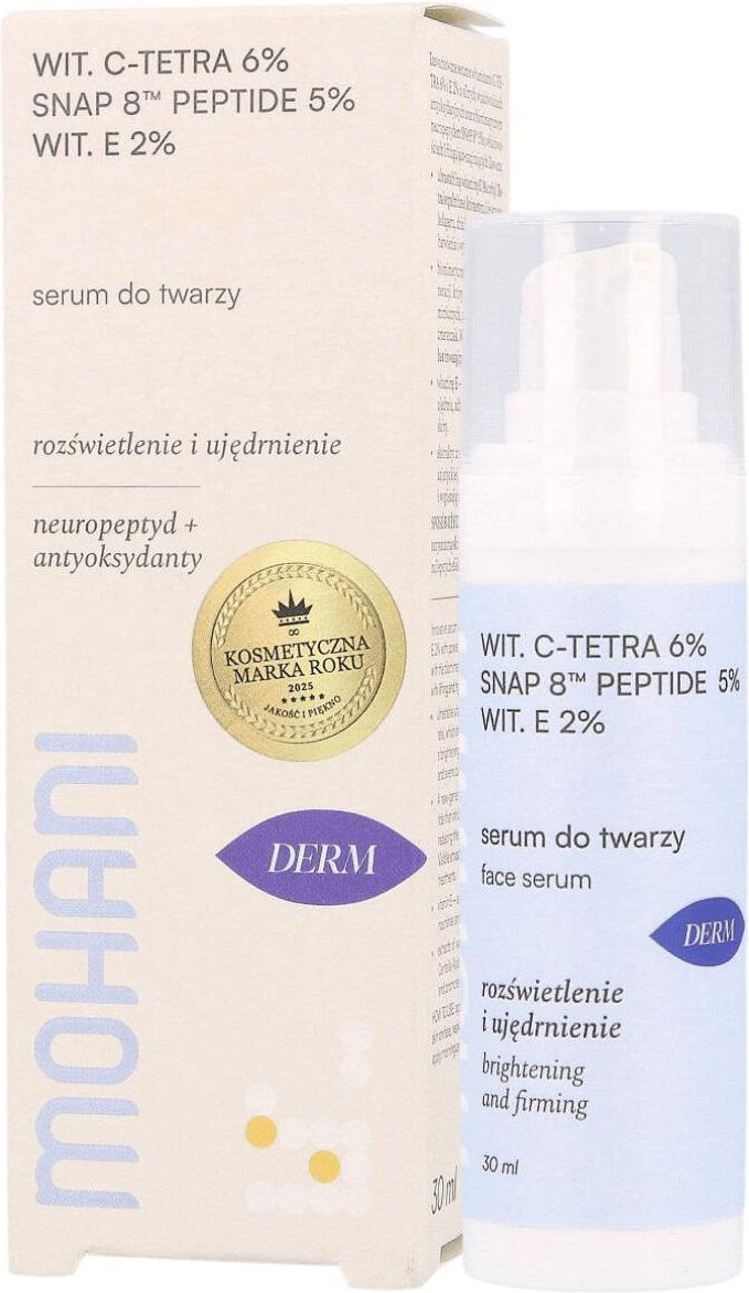 Mohani Napinająco-rozświetlające serum do twarzy z ultrastabilną witaminą C TETRA 6% neuropeptydem SNAP 8™ Peptide 5% i witaminą E 2% 30ml Śmigiel