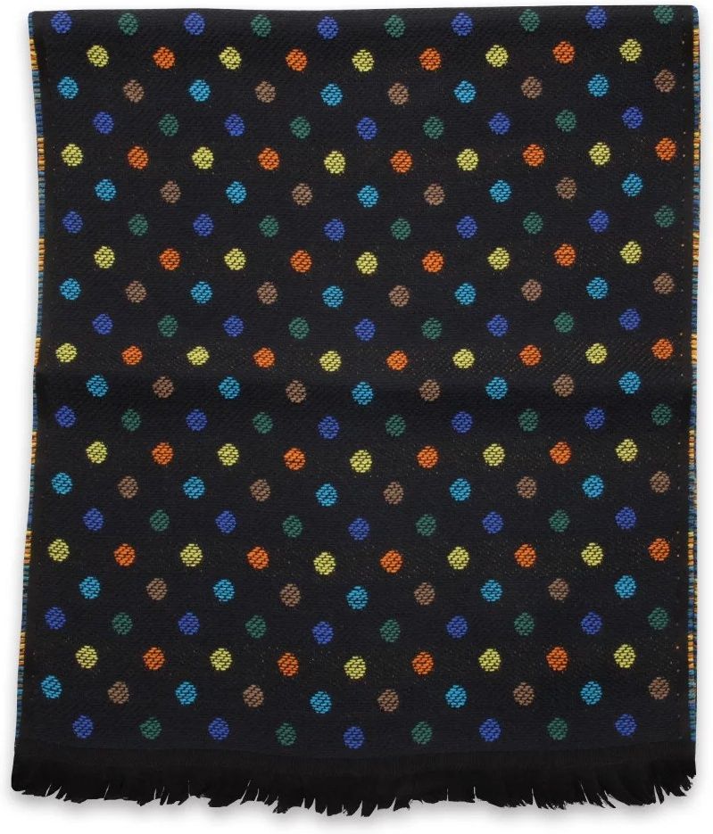 Szal wełniany Kolor: czarny, multikolor Tkanina: 100% wełna Długość: 190 cm Szerokość: 37 cm Wyprodukowano we Włoszech Elegancki szal w uniwersalnych kolorach. Urozmaici każdą koszulę, kurtkę czy płaszcz. Zakończony krótkimi frędzlami.