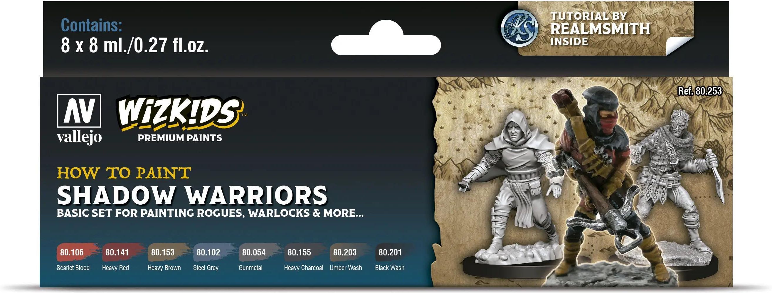 Vallejo Zestaw Wizkids Premium 80.253 Shadow warriors Ten zestaw technik jest idealny do malowania wszystkich twoich podstępnych łotrzyków i nawiedzonych czarnoksiężników w mrocznych i skradających się kolorach! Zestaw ośmiu farb akrylowych na bazie wody, wraz z przewodnikiem krok po kroku, …