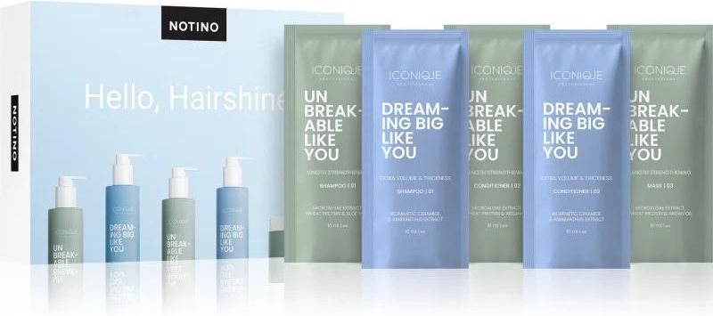 Beauty Discovery Box Notino Hello, Hairshine!, 1 szt., Zestawy kosmetyków dla kobiet, Nie możesz się zdecydować, jaką pielęgnacją włosów sprawić radość sobie lub swoim bliskim? Discovery box Beauty Discovery Box Notino Hello, Hairshine! to doskonała okazja, aby odkryć i wypróbować nowe produkty do pielęgnacji włosów zanim kupisz je w pełnym rozmiarze. W boksie znajdziesz 5 próbek z kategorii pielęgnacji włosów. Która z nich podbije Twoje serce? Zawartość zestawu: ICONIQUE Professional DREAMING BIG LIKE YOU Volume & Thickness szampon do zwiększenia objętości 10 ml ICONIQUE Professional DREAMING BIG LIKE YOU Volume & Thickness odżywka do zwiększenia objętości 10 ml ICONIQUE Professional UNBREAKABLE LIKE YOU Length Strengthening szampon wzmacniający włosy na całej długości 10 ml ICONIQUE Professional UNBREAKABLE LIKE YOU Length Strengthening maska wzmacniająca włosy na całej długości 10 ml ICONIQUE Professional UNBREAKABLE LIKE YOU Length Strengthening Length Strengthening odżywka wzmacniająca włosy na całej długości 10 ml Właściwości: doskonały pomysł na prezent sprawi radość każdej kobiecie idealny na podróż