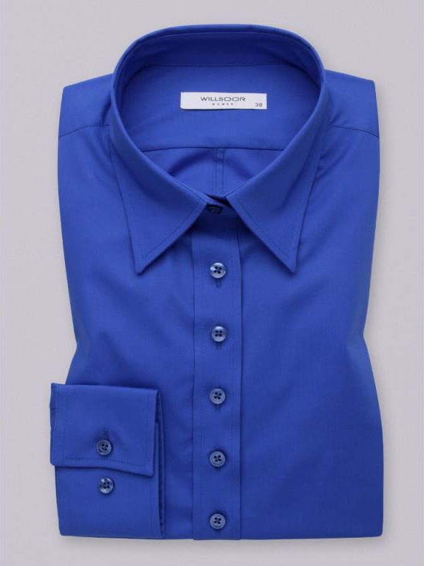 Atramentowa, taliowana koszula damska o gładkiej fakturze z krytym podpinanym kołnierzykiem, tkanina z dodatkiem elastanu