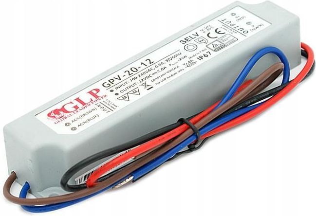 Profesjonalny wodoodporny zasilacz do LED o mocy znamionowej 24W na napięcie DC12V, marki GLP Power. Zasilacz Led model GPV-20-12, to zasilacz w hermetycznej obudowie IP67, który został wykonany z najwyższej jakości komponentów. Marka Global Leader Power, to renomowana jakości i trwałość na rynku urządzeń do zasilania oświetlenia LED. Model GLP GPV to niezawodny zasilacz hermetyczny w zamkniętej bezpiecznej obudowie do taśm LEDowych, zasila do żarówek LED, zasilacz do listw LEDowych oraz modułów LED na napięcie 12V. Parametry techniczne: moc znamionowa zasilacza: 24 Watt prąd znamionowy zasilacza: 2A maksymalna bezpieczna moc obciążeniowa zasilacza: do 19.2 Watt (patrz Uwagi) napięcie na wyjściu: 12V typ napięcia na wyjściu: DC - stałe, zasilanie na wejściu: 230V AC (w zakresie 90V÷264V) prąd AC na wejściu: 0.3A / 230V AC zakres częstotliwości napięcia: 47Hz÷63Hz tętnienia i szumy: 200mVp-p obudowa: hermetyczna ABS, chłodzenie: pasywne, klasa szczelności: IP67, klasa izolacji elektrycznej: II, zabezpieczenia: przeciążeniowe, zwarciowe, nadnapięciowe, zakres temperatury pracy: -30°C÷70°C, wymiary (dł. x szer. x wys.): 140mm x 32mm x 25mm. Uwaga: przy doborze mocy zasilacza należy uwzględnić obowiązkowy bezwzględny zapas mocy (Watt) wynoszący minimum 20%. mocy znamionowej zasilacza. (zasilacz o mocy znamionowej 100W, ma maksymalną moc obciążeniową 80W). Zachowanie zapasu powoduje prawidłową pracę zasilacza przez dłuższy czas bez zakłóceń, oraz w znacznym stopniu wydłuża trwałość zasilacza. Podłączenie zasilaczy, które nie posiadają gotowych wtyczek przyłączeniowych, do instalacji elektrycznej oraz oświetleniowej, powinien zostać wykonany przez osoby posiadające odpowiednie kwalifikacje G1 E. W naszej ofercie znajdziesz dodatkowe produkty do taśmy LED taśmy LED: standard, premium i profesjonalne na 12V i 24V, zwykłe, wodoodporne i wodoszczelne, zasilacze LED: montażowe, meblowe, hermetyczne, gniazdkowe i na szynę DIN, profile i listwy do taśm LED: meblowe, podłogowe, architektoniczne, wpuszczane, nawierzchniowe, kątowe i okrągłe, sterowniki LED: RGB, RGBW, MONO, CCT na łączność IR, RF i WiFi oraz kontrolery SmartHome, włączniki LED: włączniki meblowe do profili, włączniki do szafek, włączniki podblatowe, czujki zbliżeniowe, czujki ruchu, przewody i złączki do taśm LED Dlaczego warto wybrać naszą ofertę na rynku oświetleniowym od ponad 10 lat, sprawdzone produkty i sprawdzeni dostawcy, prawdziwe wartości i rzetelne parametry produktów (bez ściemy i bajek), najwyższe zadowolenie klientów (opinie Google), zaufanie renomowanych odbiorców, firma ze sklepami stacjonarnymi, nie twór typowo internetowy, doświadczenie i fachowe doradztwo, oferujemy własny serwis wraz z usługami dodatkowymi (nie tylko zwykła sprzedaż bez wsparcia),