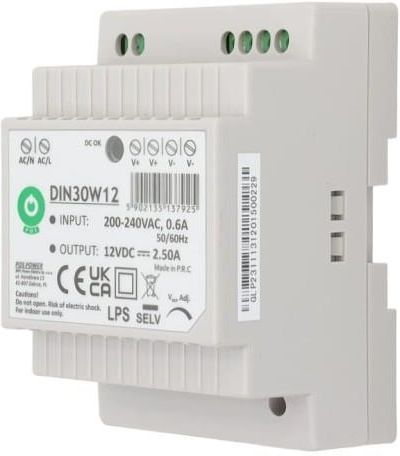 Profesjonalny zasilacz LED na szynę DIN o napięciu wyjściowym DC 12V i mocy 30 Watt. Wysokiej jakości zasilacz impulsowy marki POS, przeznaczony do montażu na szynie DIN w rozdzielni. Stałonapięciowy zasilacz LED o napięciu wyjściowym DC 12V i mocy znamionowej 30 Watt. Zasilacz wyposażony jest w uchwyt umożliwiający szybki montaż na szynie DIN, co ułatwia jego instalację. Ponadto, zasilacz posiada zabudowane złącza śrubowe, które zapewniają bezpieczne i łatwe podłączenie do instalacji elektrycznej i oświetleniowej. Dodatkowo, zasilacz LED jest wyposażony w wbudowane pokrętło do regulacji napięcia wyjściowego DC, co pozwala na zminimalizowanie spadków napięcia między zasilaczem a oświetleniem LED. Zasilacz stało-napięciowy Led z serii POS DIN, jest profesjonalnym zasilaczem do montażu w rozdzielni elektrycznej z możliwością korekty napięcia wyjściowego DC12V. Podstawowe zalety zasilacza LED DIN 12V: łatwy montaż zasilacza na szynie DIN, możliwość korekty napięcia DC12V, zmniejszenie spadku napięcia DC, wysokiej jakości komponenty elektroniczne zasilacza, wysoka stabilizacja napięcia DC 12V, sprawdzona jakość i wysoka niezawodność, dłuższa gwarancja. Podstawowe zastosowanie zasilacza LED DIN 12V: zasilanie oświetlenia Led z rozdzielni elektrycznej,, zasilanie sterowników Led w rozdzielni, zasilanie urządzeń sterujących automatyką w rozdzielni, zasilanie z rozdzielni oświetlenia Led na zewnątrz, zasilanie instalacji oświetleniowej na 12V w rozdzielni, Podstawowe parametry zasilacza Led DIN 12V: napięcie znamionowe na wyjściu: DC12V, moc znamionowa: 30 Watt, znamionowe obciążenie prądowe: 2.5A, sprawność zasilacza: ⩾84%, maksymalne bezpieczne obciążenie dla zasilacza: 24 Watt, napięcie zasilania na wejściu: AC 180V-264V, częstotliwość napięcia zasilania: 47Hz-63Hz, możliwość korekty napięcia DC na wyjściu: tak, zakres korekty napięcia DC na wyjściu: 10.8V-13.6V zabezpieczenie przeciążeniowe: tak, zabezpieczenie zwarciowe: tak, zabezpieczenie przepięciowe: tak, klasa ochronności: III, klasa szczelności: IP30, chłodzenie zasilacza: pasywne, obudowa zasilacza: plastikowa ABS, gniazda przyłączeniowe: zaciski śrubowe ukryte, wymiary zewnętrzne zasilacza (dł. x szer. x wys.): 62.5mm x 93mm x 56mm.