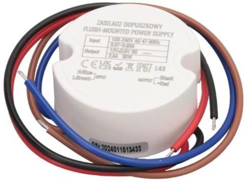 Zasilacz LED do puszkowy 12V DC, 30 Watt. Stałonapięciowy zasilacz dopuszkowy na napięcie DC 12V o mocy 30 Watt, w hermetycznej obudowie IP67 do puszki fi 60mm. Zasilacz Led który można montować w puszce elektrycznej o średnicy 60mm. Zasilacz sprawdzi się również w pomieszczeniach o dużej wilgotności jak łazienka, kuchnia, kotłownia, garaż lub na zewnątrz. Zasilacz posiada wodooporną obudowę, IP67, która chroni zasilacz przed wilgocią i przypadkowymi kroplami wody. Podstawowe zalety zasilacza puszkowego LED: hermetyczna plastikowa obudowa IP67, możliwość montażu zasilacz w puszce o średnicy 60mm, stabilizacja napięcia DC 12V, cicha praca zasilacza przy współpracy ze ściemniaczami Led PWM, Podstawowe zastosowanie puszkowego LED: do zasilania oświetlenia Led w łazience, do zasilania oświetlania na zewnątrz, zasilanie ledów w listwie oświetleniowej, zasilanie do ledów w szafach i meblach, zasilanie oświetlenia Led w pomieszczeniach o dużej wilgotności, Podstawowe parametry zasilacza puszkowego LED: napięcie znamionowe na wyjściu: DC12V, moc znamionowa: 30 Watt, znamionowe obciążenie prądowe: 2.5A, sprawność zasilacza: ⩾79%, maksymalne bezpieczne obciążenie dla zasilacza: 24 Watt, napięcie zasilania na wejściu: AC 100V-240V, częstotliwość napięcia zasilania: 47Hz-63Hz, zabezpieczenie przeciążeniowe: tak, zabezpieczenie zwarciowe: tak, zabezpieczenie nadpięciowe: tak, klasa ochronności: II, klasa szczelności: IP67, chłodzenie zasilacza: pasywne, obudowa zasilacza: hermetyczna plastikowa, długość przewodów przyłączeniowych: 140mm wymiary zewnętrzne zasilacza ( x dł.): 50mm x 22mm.
