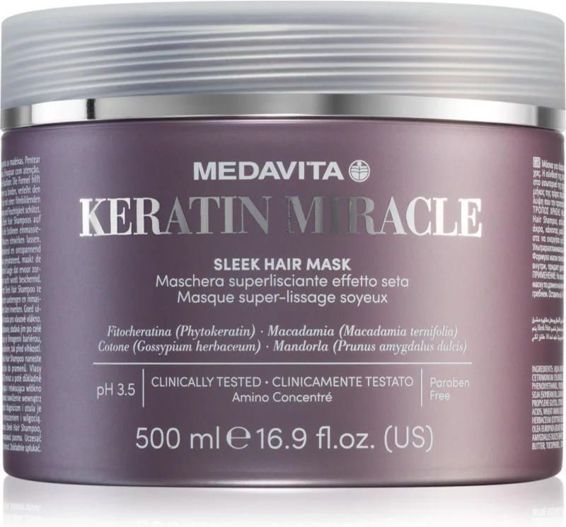 Medavita Keratin Miracle Sleek Hair Mask, 500 ml, Maseczki do włosów dla kobiet, Masz poczucie, że Twoje włosy wymagają intensywniejszej pielęgnacji niż ta, którą potrafią zapewnić odżywki lub balsamy? Maska do włosów Medavita Keratin Miracle Sleek Hair Mask doskonale wzbogaci Twoją rutynę …