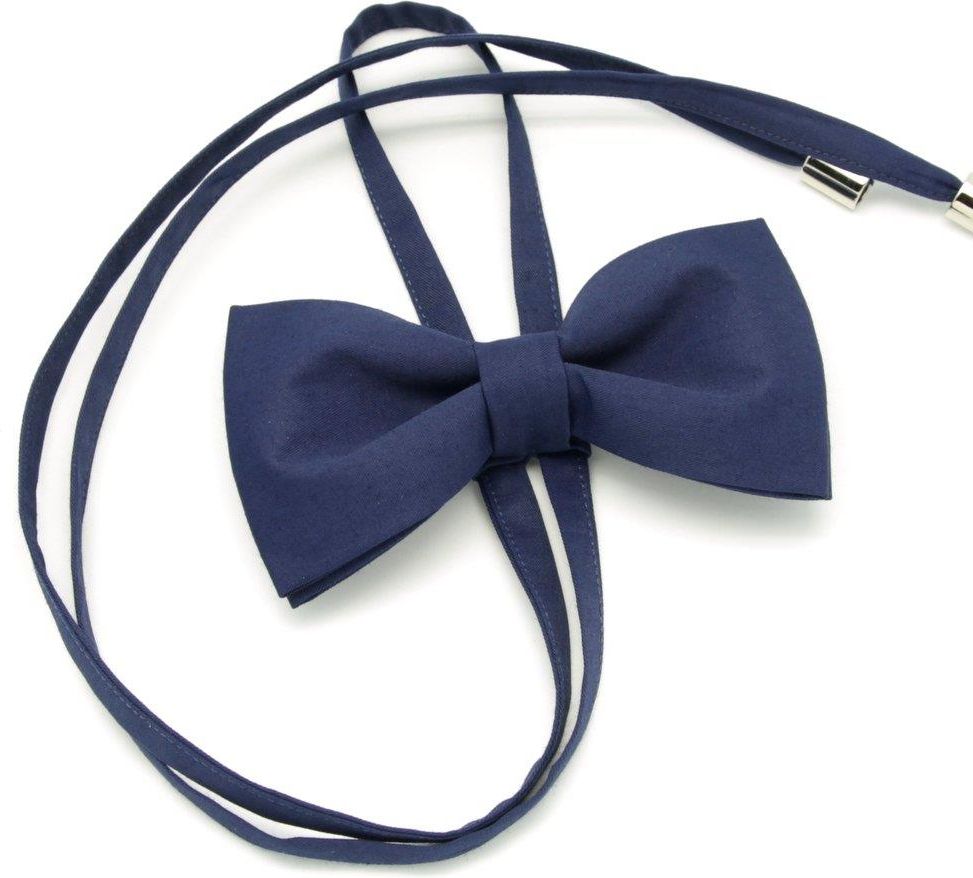 Mucha damska Willsoor Zestaw składający się z muchy gotowej opakowanej w stylowy woreczek i kartonowe pudełko. Muchę swobodnie przesuwa się po paskach co sprawia, że można ją nosić na wiele sposobów: na szyi jako ozdoba spełniająca rolę naszyjnika, pod szyją jako tradycyjną muszkę, we włosach lub jako pasek. Elegancko zapakowany zestaw jest również idealnym pomysłem na prezent. - Tkanina: 100% bawełny - Kolor muchy: gładka granatowa - Długość paska: 70cm - Wymiary: 12cm x 5,5cm - Opakowanie: woreczek i kartonowe pudełko Willsoor - Producent: Willsoor