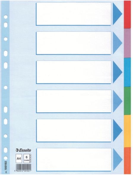 Przekladki kartonowe kolorowe A4 6 kart 1-6 100192 ESSELTE Wytrzymale przekladki, utrzymane w zywej tonacji kolorystycznej. Wykonane z kartonu pochodzącego z odzysku, posiadają certyfikat Blue Angel. Wierzchnia karta z wydzielonymi, duzymi powierzchniami na opisy. Wzmocniony perforowany pasek na …