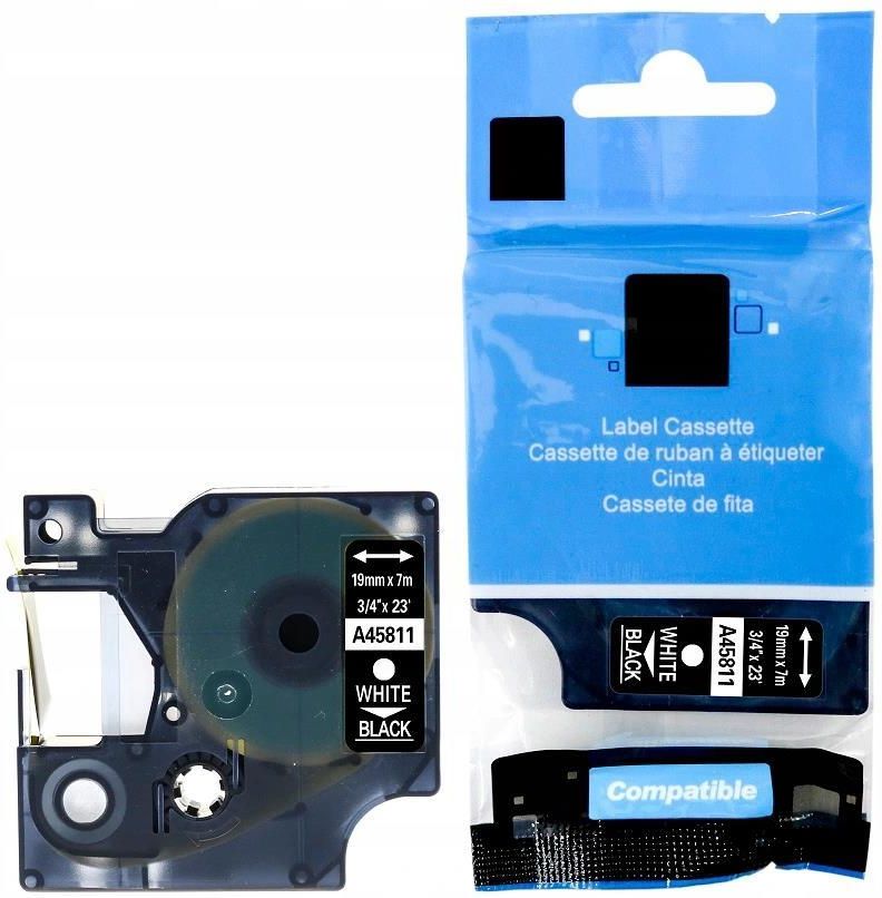 Taśma do Dymo D1 45811 19mm 7m czarna/biały Najwyższej jakości zamienniki taśm do drukarek: MODEL:(A45811)45811 taśma 19mm x 7mczarna/biały MATERIAŁ TAŚMY:TWORZYWO SZTUCZNE RODZAJ KLEJU:TRWAŁY,Z MOŻLIWOŚCIĄ ODKLEJENIA POWIERZCHNIA APLIKACJI:PLASTIK, METAL, PAPIER, DREWNO, SZKŁO TECHNIKA DRUKU:TERMO - TRANSFER ODPORNY NA DZIAŁANIE:WODY, OLEJU, PROMIENI UV, ŁAGODNYCH ROZPUSZCZALNIKÓW KOMPATYBILNY MIĘDZY INNYMI Z DRUKARKAMI Label Manager:LM 500TS, LM Wireless PnP, LM100, LM100+, LM110, LM120, LM120P, LM150, LM155, LM160, LM200, LM210, LM210D, LM220, LM220P, LM260, LM260P, LM280, LM300, LM350, LM360, LM360D, LM400, LM420P, LM420P, LM450, LM450D, LM500TS, LMPCII, LMPnP, Label Point:LP100, LP150, LP200, LP250, LP250, LP300, LP350, LP350, LP400, LP450, Label Writer:LW 400 Duo, LW 450 Duo, MobileLabeler1978246 Dymo Rhino- 4200, 5000, 5200, Pro6000 INNE MODELE TAŚM DYMO D1: Kolor taśmy/Kolor nadrukuSzerokości: 6mm | 9mm | 12mm | 19mm | 24mmprzezroczysty/czarny 43610 | 40910 | 45010 | 45800 | 53710przezroczysty/niebieski 43611 | 40911 | 45011 | 45801 | 53711przezroczysty/czerwony 43612 | 40912 | 45012 | 45802 | 53712biały/czarny 43613 | 40913 | 45013 | 45803 | 53713biały/niebieski 43614 | 40914 | 45014 | 45804 | 53714biały/czerwony 43615 | 40915 | 45015 | 45805 | 53715niebieski/czarny 43616 | 40916 | 45016 | 45806 | 53716czerwony/czarny 43617 | 40917 | 45017 | 45807 | 53717żółty/czarny 43618 | 40918 | 45018 | 45808 | 53718zielony/czarny 43619 | 40919 | 45019 | 45809 | 53719przezroczysty/biały 43620 | 40920 | 45020 | 45810 | 53720czarny/biały 43621 | 40921 | 45021 | 45811 | 53721srebrny/czarny 43622 | 40922 | 45022 | 45812 | 53722złoty/czarny 43623 | 40923 | 45023 | 45813 | 53723czarny/złoty 43624 | 40924 | 45024 | 45814 | 53724przezroczysty/złoty 43625 | 40925 | 45025 | 45815 | 53725