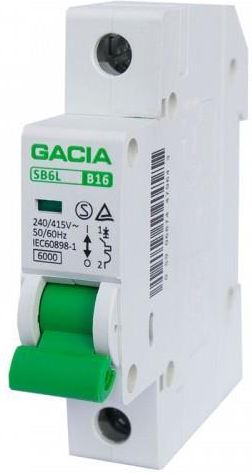 Wyłącznik nadprądowy GACIA C16A 1P 6kA Typ S eska SB6L C 1P 16A Wyłącznik nadprądowy jest komponentem instalacji elektrycznej, jego zadaniem jest zapewnienie ochrony przed skutkami zwarć i przeciążeń. Działanie wyłącznika nadprądowego polega na przerwaniu ciągłości obwodu, gdy prąd płynący w obwodzie przekroczy wartość bezpieczną dla tego obwodu. Bezpieczniki nadprądowe o charakterystyce C cechuje opóźnione działanie. Stosuje się je dla ochrony urządzeń o zwiększonym prądzie rozruchowym, np. silników. prąd znamionowy In 16A charakterystyka pracy C liczba modułów (biegunów) 1P napięcie znamionowe Ue 240/415 V izolacja znamionowa Ui 500 V znamionowa odporność impulsowa (1,2/50) Uimp 6000V częstotliwość pracy 50/50Hz znamionowa zdolność łączeniowa 6kA stopień ochrony IP20 żywotność elektryczna 4000 żywotność mechaniczna 10000 montaż na szynie DIN (TH/TS 35) temperatura składowania od -30 do +70°C temperatura otoczenia pracy (przy pracy poniżej 0°C, aparat należy zabezpieczyć przed oszronieniem) od -30 do +50°C maksymalna pojemność zacisków 25 mm2 moment dokręcenia zacisków podłączeniowych 3 Nm montaż wewnętrzny wymiary szerokość:17.5mm wysokość:80mm głębokość:64mm wskaźnik pozycji pracy tak możliwość połączenia za pomocą szyn grzebieniowych tak przystosowane do późniejszego montażu urządzeń pomocniczych tak ochrona obwodów przed przeciążeniem tak ochrona obwodów przed zwarciem tak po rozłączeniu separacja w obwodzie tak normy IEC/EN 60898-1 certyfikaty SEMKO, TÜV, CE producent GACIA kod producenta SB6L C 1P 16A kod EAN 5906874479650