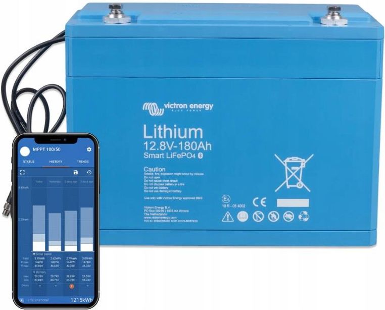LiFePO4 battery 12.8V/180Ah - Smart Victron energy Akumulator LiFePO4 Smart 180Ah 12VZarządzanie baterią (BMS)Akumulator wyposażony jest w zaawansowany system zarządzania baterią (BMS), który chroni przed przeładowaniem, nadmiernym rozładowaniem, przegrzaniem oraz zwarciem. Smart BluetoothWbudowany moduł Bluetooth umożliwia zdalne monitorowanie akumulatora przez aplikację VictronConnect na smartfonie lub tablecie – sprawdź stan naładowania, historię i parametry pracy. Kompaktowa konstrukcjaLiFePO₄ jest znacznie lżejszy od klasycznych akumulatorów AGM/GEL. Idealny do kamperów, łodzi, off-gridu i instalacji mobilnych.Wyjątkowa trwałość i wydajnośćTechnologia litowo-żelazowo-fosforanowa (LiFePO₄) pozwala uzyskać ponad 3000 cykli przy 80% DoD, co przekłada się na wiele lat pracy bez spadku wydajności – to kilkukrotnie więcej niż w przypadku akumulatorów AGM/GEL.Możliwość łączenia i skalowaniaAkumulatory można bezpiecznie łączyć szeregowo (wyższe napięcie) lub równolegle (większa pojemność) – nawet do 20 jednostek w jednym banku. Idealne rozwiązanie dla systemów 12V, 24V i 48V.Efektywność energetycznaLiFePO₄ od Victron Energy zapewnia wyjątkową sprawność ładowania i rozładowania, co minimalizuje straty i maksymalizuje dostępność energii – zarówno w systemach mobilnych, jak i stacjonarnych.Bezpieczeństwo i środowiskoTechnologia LiFePO₄ jest jedną z najbezpieczniejszych litowych technologii dostępnych na rynku. Odporność na przegrzanie, brak gazów, niskie ryzyko pożaru i wysoka możliwość recyklingu sprawiają, że jest to ekologiczny wybór na długie lata. Główne cechy Pojemność: 180 Ah – duża ilość energii w kompaktowej formie. Technologia: LiFePO₄ – trwałość, bezpieczeństwo, brak ryzyka zapłonu. Bluetooth Smart – monitoruj z telefonu dzięki VictronConnect. Wbudowany BMS – automatyczne balansowanie i ochrona ogniw. 3000+ cykli przy 80% DoD – wyjątkowa trwałość. Łączenie do 20 sztuk – szeregowanie lub równoległe łączenie banków. Sprawność do 92% – więcej energii z każdego cyklu. Ultralekka obudowa – łatwy montaż, mniejszy ciężar. Szeroki zakres temperatur – odporność na warunki terenowe. Specyfikacja techniczna Parametry / Model: Victron Energy 180Ah LiFePO4 Napięcie nominalne: 12,8 V Pojemność nominalna @ 25°C: 180 Ah Pojemność nominalna @ 0°C: 150 Ah Pojemność nominalna @ -20°C: 90 Ah Energia nominalna @ 25°C: 2304 Wh Żywotność cykliczna (wydajność ≥ 80%) 80% DoD: 2500 cykli 70% DoD: 3000 cykli 50% DoD: 5000 cykli Rozładowanie Maksymalny ciągły prąd rozładowania: 360 A Zalecany ciągły prąd rozładowania: ≤180 A Napięcie końca rozładowania: 11,2 V Opór wewnętrzny: 0.9 mΩ Warunki działania Temperatura pracy: Rozładowanie: -20°C do +50°C, Ładowanie: +5°C do +50°C Temperatura magazynowania: -45°C do +70°C Wilgotność (bez kondensacji): Maks. 95% Klasa ochrony: IP22 Ładowanie Napięcie ładowania: 14 V – 14,4 V (zalecane 14,2 V) Napięcie pływakowe: 13,5 V Maksymalny prąd ładowania: 360 A Zalecany prąd ładowania: ≤90 A Inne Maksymalny czas przechowywania w 25°C: 1 rok Połączenie z BMS: Kabel męski + żeński z okrągłym złączem M8 (50 cm) Podłączenie zasilania: Wkładki gwintowane M8 Wymiary (wys. x szer. x gł.): 237 × 321 × 152 mm Waga: 18 kg Victron LiFePO₄ Battery 12.8 V/180 Ah – Smart to zaawansowany akumulator litowo‑żelazowo‑fosforanowy o nominalnej pojemności 180 Ah, wyposażony w inteligentny BMS z balansem ogniw i modułem Bluetooth, umożliwiający monitorowanie stanu baterii (napięcie, temperatura) przez aplikację. Można go łączyć szeregowo i równolegle, tworząc banki 12 V, 24 V lub 48 V o dużej pojemności.