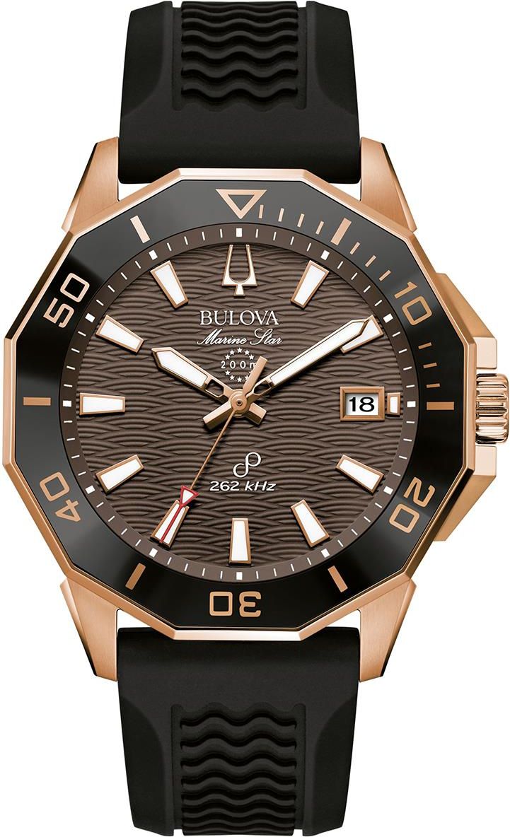 Zegarek męski BULOVA Marine Star 98B421 BULOVA Marine Star 98B421 to męski zegarek sportowy z kolekcji Marine Star, który łączy w sobie elegancję i funkcjonalność. Stworzony przez renomowanego producenta Bulova, zegarek ten wyróżnia się nowoczesnym designem i zaawansowaną technologią. Idealny dla aktywnych mężczyzn, którzy cenią sobie wysoką jakość i styl, zegarek BULOVA Marine Star 98B421 doskonale sprawdzi się w każdej sytuacji, zarówno na co dzień, jak i podczas sportowych wyzwań. Tarcza i szkło Tarcza zegarka BULOVA Marine Star 98B421 ma głęboki brązowy kolor, który kontrastuje z indeksami i wskazówkami pokrytymi materiałem luminescencyjnym, zapewniającym doskonałą czytelność w każdych warunkach oświetleniowych. Na godzinie trzeciej znajduje się funkcjonalny datownik, który dodaje praktyczności temu eleganckiemu modelowi. Tarcza jest chroniona szafirowym szkłem, które jest wyjątkowo odporne na zarysowania i pęknięcia, co gwarantuje długotrwałą ochronę i przejrzystość. Insert bezla (nazywany też wkładką) jest ceramiczny - co zapewnia zwiększoną odporność na uszkodzenia mechaniczne ale także zapewnia odporność na działania promeni UV i nie blaknie pod ich wpływem. Koperta i pasek Koperta zegarka BULOVA Marine Star 98B421 wykonana jest z wysokiej jakości stali szlachetnej w odcieniu różowego złota, co nadaje zegarkowi elegancki i luksusowy wygląd. Koperta o szerokości 43 mm jest idealna dla mężczyzn ceniących wyraziste dodatki. Wodoszczelność na poziomie 200 metrów sprawia, że zegarek jest odporny na kontakt z wodą, co czyni go odpowiednim do pływania i nurkowania. Zegarek wyposażony jest w czarny pasek, który doskonale komponuje się z kolorem koperty, zapewniając komfort noszenia i stylowy wygląd. Mechanizm BULOVA Marine Star 98B421 napędzany jest precyzyjnym mechanizmem kwarcowym, co gwarantuje niezawodność i dokładność chodu. Mechanizm kwarcowy znany jest z długiej żywotności i minimalnych wymagań konserwacyjnych, co czyni ten model doskonałym wyborem dla osób ceniących sobie bezproblemowe użytkowanie. Zegarek jest wyposażony w 200-metrową wodoszczelność, co oznacza, że doskonale sprawdzi się zarówno na lądzie, jak i w wodzie. O marce Bulova Bulova to marka wywodząca się z samego serca Stanów Zjednoczonych. W 1875 roku Joseph Bulova otworzył w bogatej dzielnicy Nowego Jorku sklep jubilerski. W roku 1911 rozpoczęto produkcję pierwszych zegarków. Wszystkie części produkowane były ręcznie, a zegarki szybko zdobyły miano prestiżowych ze względu na bogate zdobienie i stosowanie kamieni szlachetnych. Już w roku 1924 powstały pierwsze zegarki damskie wysadzane drogimi kamieniami. Do historii przeszedł przełomowy i kultowy model Accutron, a Bulova na stałe zagościła na pokładzie wielu misji NASA. W samym Białym Domu zegarki Bulova są oficjalnym prezentem. ZOBACZ RÓWNIEŻ {{widget type="Magento\CatalogWidget\Block\Product\ProductsList" template="Magento_PageBuilder::catalog/product/widget/content/carousel.phtml" anchor_text="" id_path="" show_pager="0" products_count="20" condition_option="category_ids" condition_option_value="553" type_name="Catalog Products Carousel" conditions_encoded="^[`1`:^[`aggregator`:`all`,`new_child`:``,`type`:`Smile||ElasticsuiteVirtualCategory||Model||Rule||WidgetCondition||Combine`,`value`:`1`^],`1--1`:^[`operator`:`==`,`type`:`Smile||ElasticsuiteVirtualCategory||Model||Rule||WidgetCondition||Product`,`attribute`:`category_ids`,`value`:`553`^]^]" sort_order="date_newest_top"}}
