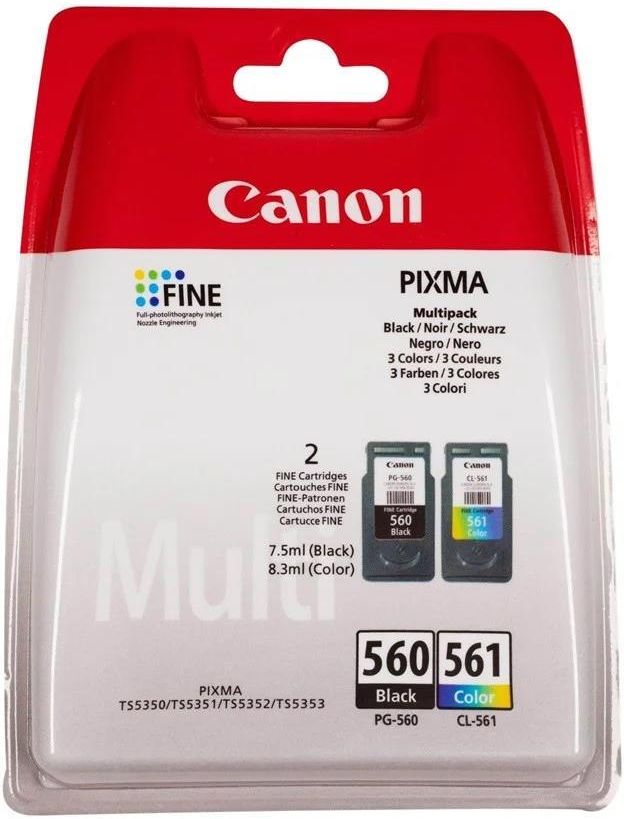 Canon PG-560 z czarnym atramentem i CL-561 z kolorowym atramentem  Niższe wydatki na atrament i większy komfort pracy dzięki wielopakowi obejmującemu kasety z czarnym i kolorowym atramentem Wydawaj mniej, drukuj więcej Możliwość wydrukowania nawet 180 kolorowych dokumentów i 180 czarno-białych dokumentów formatu A4 1 kaseta z kolorowym atramentem i 1 kaseta z czarnym atramentem Ten dwupak zawiera 1 kasetę o pojemności 8,3 ml z kolorowym atramentem i 1 kasetę o pojemności 7,5 ml z czarnym atramentem do drukowania dokumentów i zdjęć w żywych kolorach. Zaprojektowana z myślą o trwałych wydrukach kaseta umożliwia wydrukowanie nawet 180 stron dokumentów formatu A4. Korzyści: Twórz atrakcyjne, żywe i wyraźne zdjęcia i dokumenty Każda kaseta umożliwia wydrukowanie nawet 180 stron dokumentów formatu A4 Postaw na spójną jakość i niezawodność oryginalnego atramentu firmy Canon Zadbaj o środowisko – zwracaj zużyte kasety z atramentem do ponownego wykorzystania lub recyklingu Zgodność: PIXMA TS5350 PIXMA TS5351 PIXMA TS5352 PIXMA TS5353 PIXMA TS7450 PIXMA TS7451 PIXMA TS5351a PIXMA TS7450a PIXMA TS5350a PIXMA TS5352a PIXMA TS7451a PIXMA TS7451i PIXMA TS5350i PIXMA TS7450i PIXMA TS5351i
