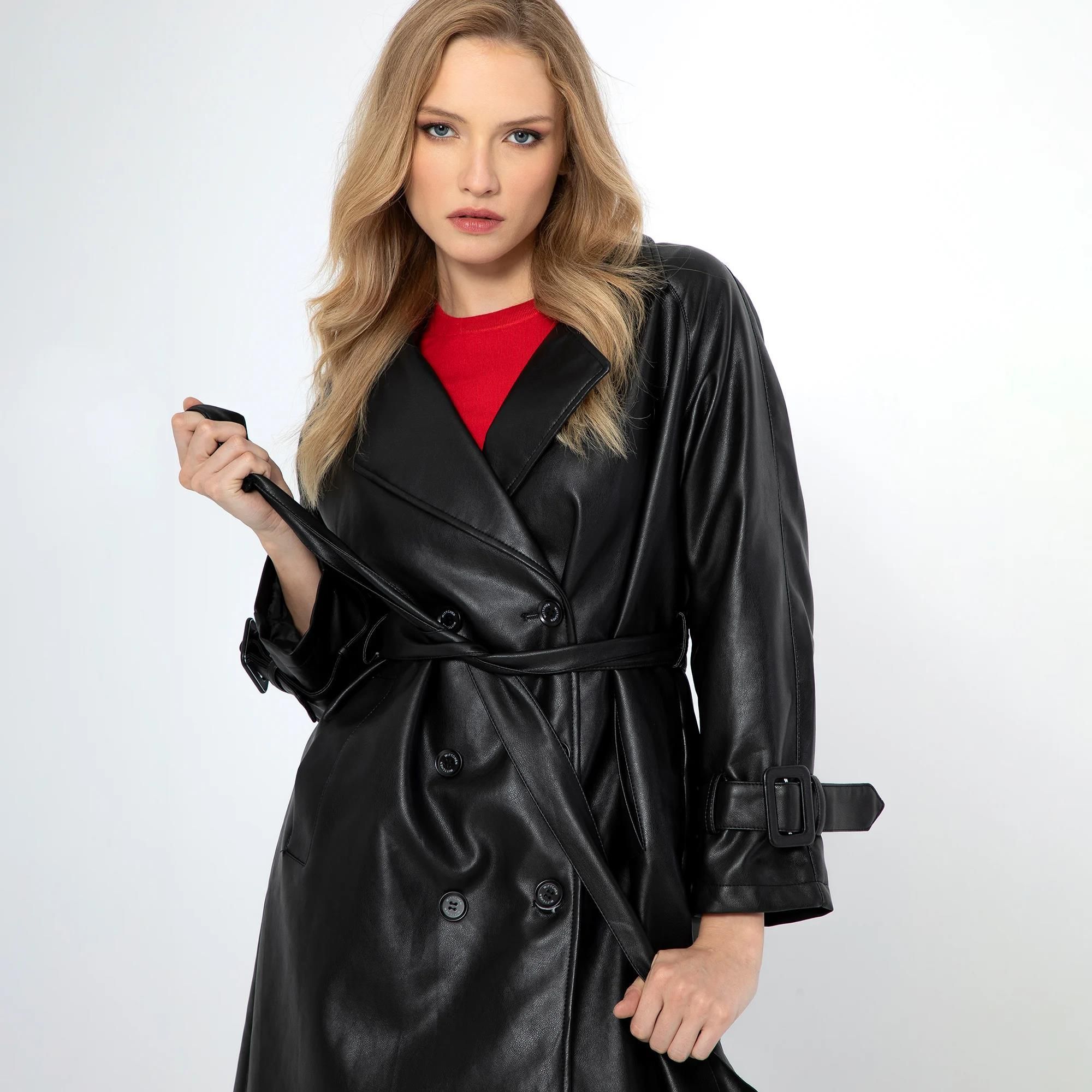Damski płaszcz z ekoskóry dwurzędowy czarny Sochaczew