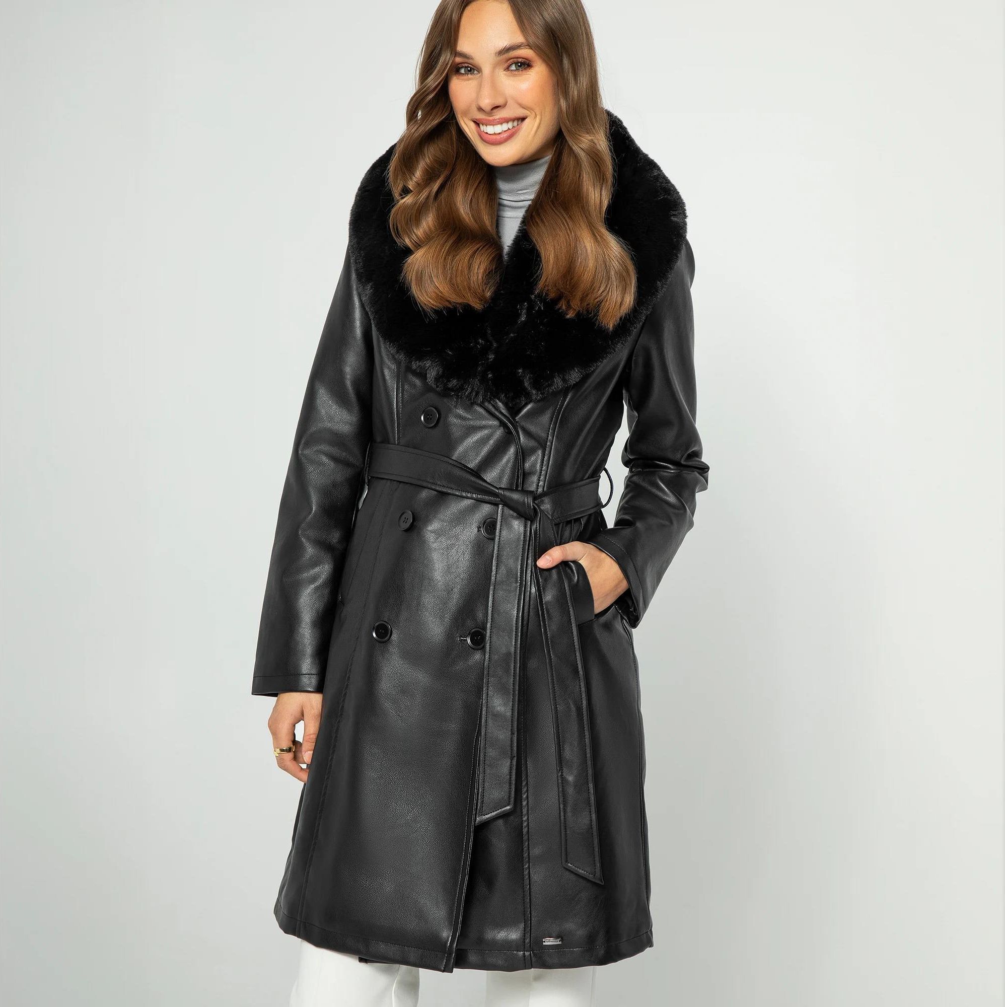 Damski płaszcz z ekoskóry i sztucznego futra czarny Sochaczew