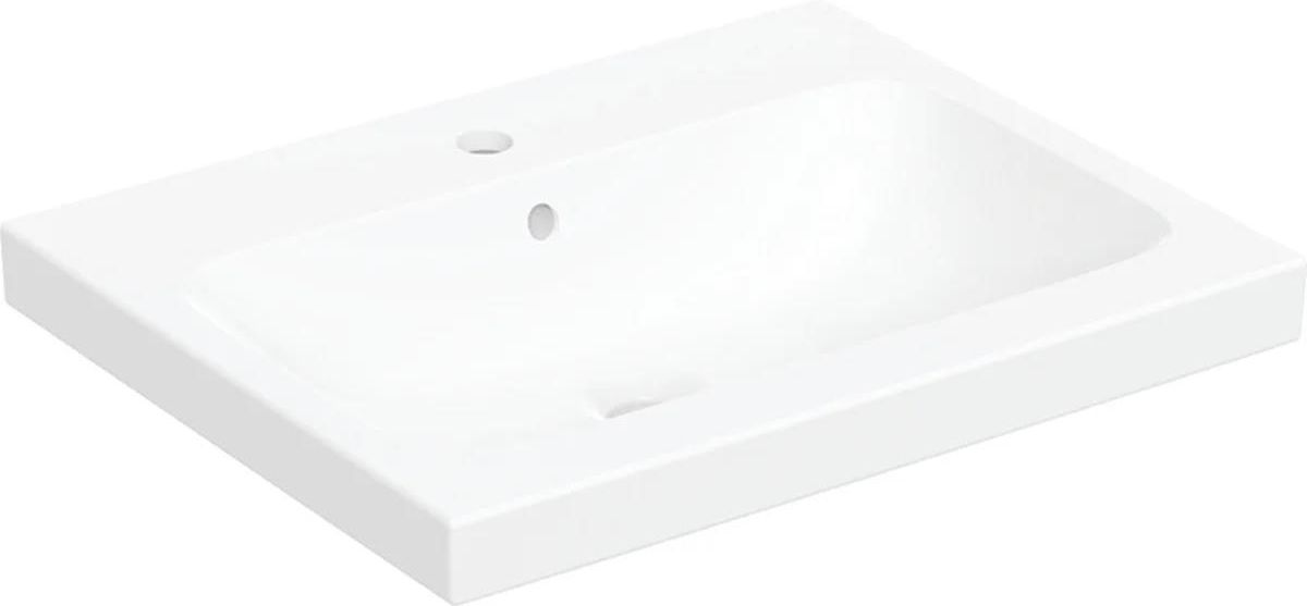 Szerokość: 60 cm Głębokość: 48 cm Wysokość: 16 cm Otwór na baterię na środku Z przelewem Do montażu na blacie Mocowanie do ściany Spód i tył umywalki szlifowane Materiał: ceramika Specjalne szkliwo Geberit KeraTect® zapewnia długotrwałą ochronę powierzchni ceramicznych: jest gładka i odporna na zabrudzenia, a zatem łatwa w pielęgnacji Kolor: biały