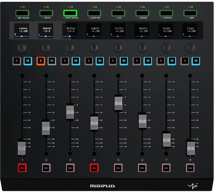 MIDIPLUS UP - Nadchodzi nowy król! Rewelacyjny kontroler UP już dostępny! Podłącz do niego od 1 do 3 UP+ i stwórz zestaw z 32 zmotoryzowanymi faderami! Idealny do obsługi Twojego ulubionego DAW, bez względu czy używasz Ableton, Logic Pro czy Cubase! Kontroler jest kompatybilny z protokołami HUI i MACKIE. Dzięki naszemu rozwiązaniu możesz pracować szybciej i skuteczniej niż kiedykolwiek! Up wyposażony jest w czułe na dotyk, zmotoryzowane fadery o długości 100 milimetrów, klikalne encodery, kolorowe wyświetlacze i przyciski z podświetleniem RGB. Urządzenie jest wyposażone w rozkładaną podstawkę, aby zapewnić Ci wygodę użytkowania na płasko, lub pod kątem 8 stopni. Klikalny "Jog Wheel" wraz z przyciskami znajdującymi się na pokładzie sprawia, że edytujesz i miksujesz z większą łatwością! Wykorzystując narzędzie, jakim jest UP, możesz skupić się na tym, co najważniejsze, nie tracąc zbędnego czasu na klikanie parametrów na ekranie komputera! Sprawdź już dziś, jak bardzo poprawi to Twój Workflow! Specyfikacja Fadery: 8 czyłych na dotyk, zmotoryzowanych faderów o długości 100 mm Enkodery: 8 klikalnych pokręteł Przyciski: 32 sylikonowe przyciski z podświetleniem RGB Wyświetlacze: 8 kolorowych wyświetlaczy LCD 1.3" Połączenia: 1x USB-C, 1x USB-A, 1x DC IN Zasilanie: DC 12V, 2.0A, Center-positive Wymiary (szer. x wys. x gł.): 329 x 54 x 294 mm Waga: 2.9 kg