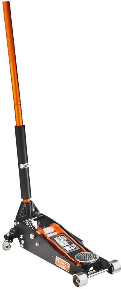 Hydrauliczny podnośnik na kółkach firmy BAHCO jest przeznaczony do podnoszenia i opuszczania pojazdów mechanicznych, takich jak samochody i ciężarówki, w warsztatach i garażach. Podnośnik hydrauliczny ma w 100% aluminiowy korpus i podnoszące ramię, co zapewnia elastyczną i lekką konstrukcję ułatwiającą transport. Narzędzie posiada dwa cylindry zmniejszające niezbędną ilość ruchów aż o 50% oraz pokrywę przeciwpyłową, która chroni cylindry i sprężynę, zmniejszając ryzyko uszkodzenia spowodowanego przez kurz i brud. Dołączone gumowe siodełko chroni powierzchnie i zapobiega przed wyślizgnięciem się spod obiektu. Wygięty uchwyt zapewnia większy komfort pracy i lepszy dostęp. Podnośnik wózkowy jest wyposażony w koła stalowe pokryte PU, które zapewniają zarówno doskonałą wytrzymałość, jak i cichą pracę. W dolnej części uchwytu znajduje się przydatny przybornik do przechowywania narzędzi, śrub i nakrętek. Bezpieczny zawór ciśnieniowy zapobiega przeciążeniu, a zawór obniżający ciśnienie zapewnia bezpieczne opuszczanie, nawet przy maksymalnym obciążeniu.