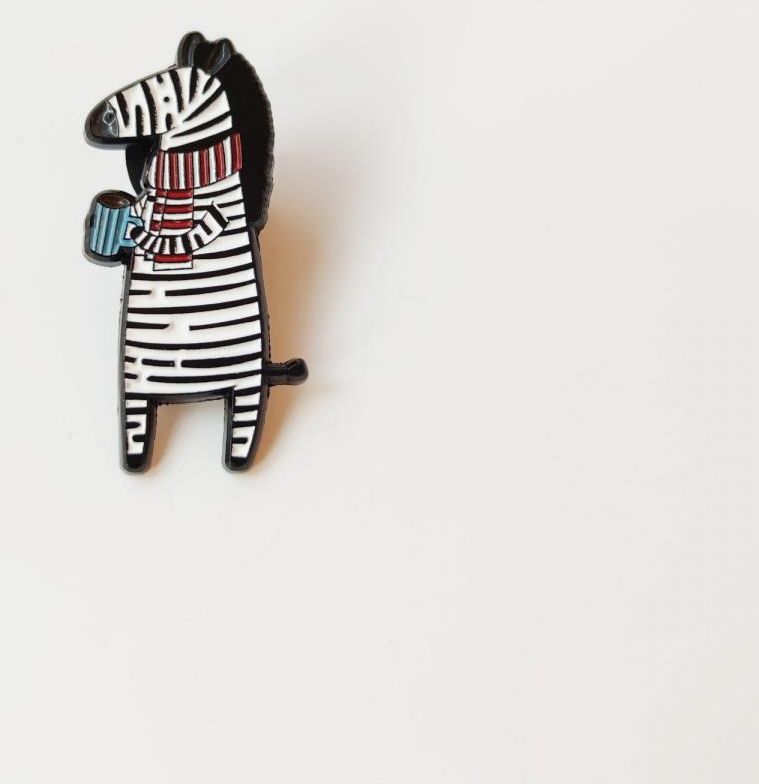 Przypinka - Zebra z kawą Czy mamy tu miłośników pasiastych zwierzątek? Bo miłośników kawy na pewno :) Rozmiar: 32mmx 30mm Sztyf emaliowany