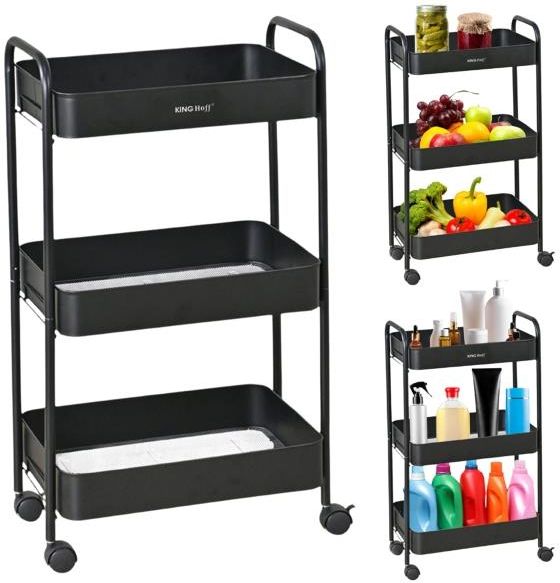 Elegancki, praktyczny i niezwykle funkcjonalny — trzy­poziomowy regał mobilny KINGHoff to doskonałe rozwiązanie do kuchni, łazienki, salonu lub biura. Dzięki solidnej stalowej konstrukcji i nowoczesnemu czarnemu wykończeniu idealnie wpasuje się w każde wnętrze, zapewniając wygodne miejsce do przechowywania i łatwy dostęp do niezbędnych przedmiotów. Regał został zaprojektowany z myślą o maksymalnej mobilności. Wyposażony w kółka obrotowe 360° oraz funkcję blokady, gwarantuje pełną kontrolę nad przemieszczaniem i stabilnością. Trzy przestronne półki oferują dużo miejsca na napoje, akcesoria kuchenne, kosmetyki, rośliny czy ręczniki — w zależności od potrzeb użytkownika. Cechy produktu Wykonany z wysokiej jakości stali zapewniającej trwałość i stabilność Trzy pojemne półki idealne do przechowywania różnych przedmiotów Kółka obrotowe 360° umożliwiające łatwe przemieszczanie Funkcja blokady kółek dla większego bezpieczeństwa użytkowania Prosty montaż bez użycia narzędzi Uniwersalne zastosowanie – do kuchni, łazienki, biura lub salonu Kolor: czarny Wymiary: 44,7 × 30,6 × 77,3 cm Dzięki minimalistycznemu designowi i funkcjonalnej konstrukcji, ten regał mobilny sprawdzi się zarówno w nowoczesnych, jak i klasycznych wnętrzach. To idealny wybór dla osób ceniących porządek, wygodę i estetykę w codziennym użytkowaniu.