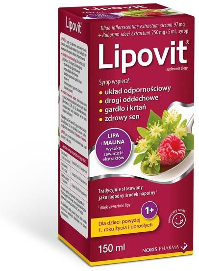Lipovit Lipa I Malina Syrop syrop na gardło i krtań 150 ml NORIS POLSKA SP. Z O.O. Lipovit Lipa I Malina Syrop syrop na gardło i krtań 150 ml Wskazania LIPOVIT to produkt przeznaczony dla osób dorosłych oraz dzieci powyżej 1. roku życia, do stosowania w celu wsparcia układu odpornościowego, układu …