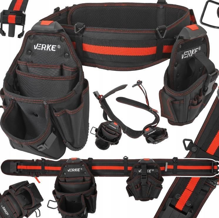 PAS NARZĘDZIOWY 3 CZ. VERKE Pas narzędziowy z dwiema przesuwanymi sakwami z licznymi kieszeniami oraz pentlą na młotek. Każda sakwa wpinana na uchwyt typu klik. Mocny ergonomiczny pas zapinany na rzep, suwak oraz dodatkowo zapinany klamrą. Posiada uchwyty do montażu szelek. Materiał poliester 1680D …
