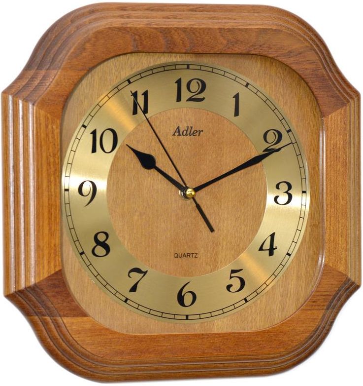 Zegar ścienny drewniany kwarcowy Adler Klasyczny drewniany zegar ścienny z mechanizmem zasilanym na baterie. Klasyczna ośmiokątna obudowa z zaokrąglonymi i profilowanymi narożnikami. Tarcza w formie obręczy, wykonana z metalu w kolorze złotym. Wysokość: 28,5 cm Szerokość: 28,5 cm Głębokość: 4 cm Waga: 800 g Materiały: drewno, metalowe części koloru złotego (tarcza), szyba szklana transparentna Tarcza: metalowa obręcz z cyframi koloru złotego, cyfry czarne, stylizowane, arabskie Wskazówki: godzinowa, minutowa i sekundowa, wskazówki złote ,proste zakończone strzałkami Mechanizm zegara: kwarcowy, 1 bateria R16 (paluszek; nie załączona) Mocowanie na ścianie: otwór w plastikowej obudowie mechanizmu z tyłu zegara 2 lata gwarancji