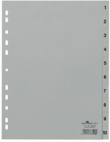 PRZEKŁADKA PP A4 1-10 DURABLE SZARE INDEKSY 651110 Z tłoczonymi znacznikami do numerycznego oznaczenia. Znaczniki: 1-10 Format DIN A4 pionowy Ilość arkuszy/podziałka: 10 Wysokość x szerokość w mm: 297 x 215/230 Dziurkowanie: uniwersalne