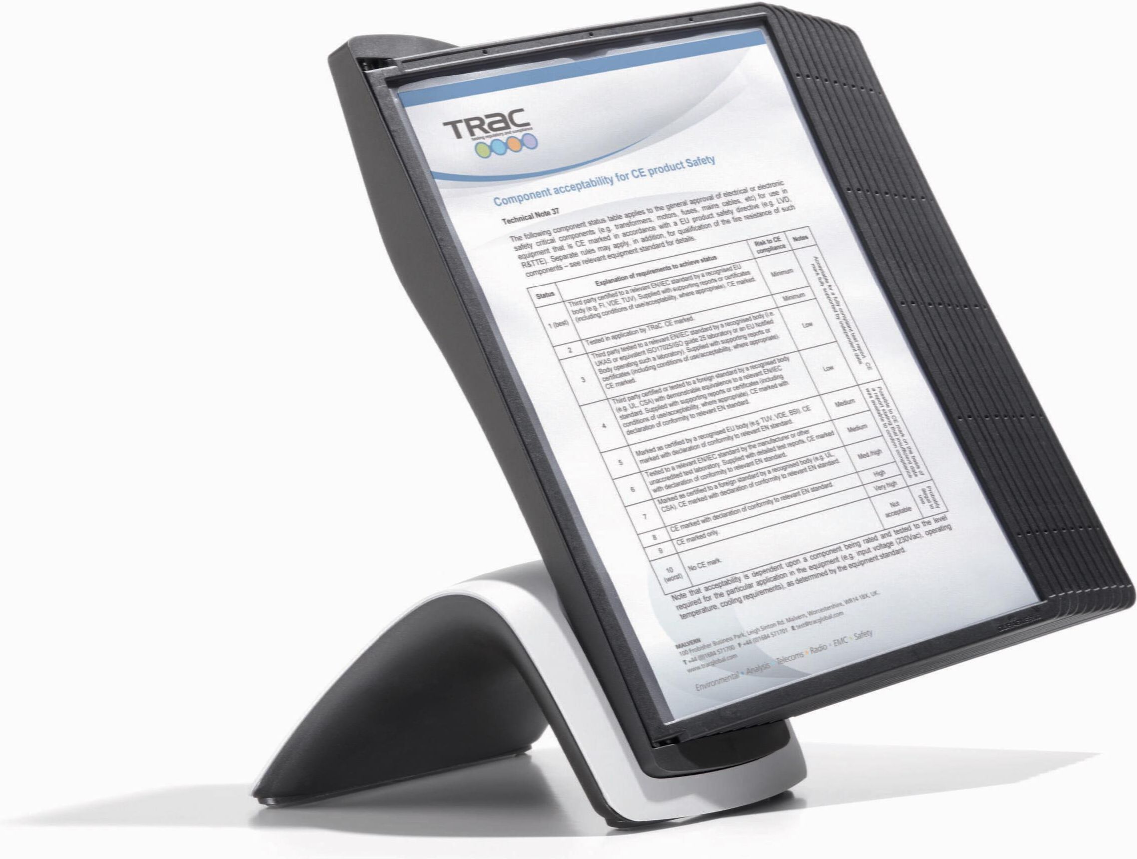 Składa się z wysokiej jakości uchwytu stołowego w kolorze czarno-szarym oraz pasujących do niego paneli (indeksów) w kolorze czarnym. Obszerny stołowy zestaw prezentacyjny Stojak stołowy z 10 panelami prezentacyjnymi SHERPA® w formacie A4 Antypoślizgowy stojak stołowy w kolorze czarnym/szarym gwarantujący dobrą stabilność Panele prezentacyjne wykonane z polipropylenu, z kolorową ramką i folią nadającą się do skanerów dzięki niewielkiemu współczynnikowi odbicia światła Produkt jest wyposażony w zakładki indeksujące z pustymi wkładami do opisu paneli Praktyczny mechanizm sworzniowy zapewnia łatwą wymianę paneli 5 lat gwarancji
