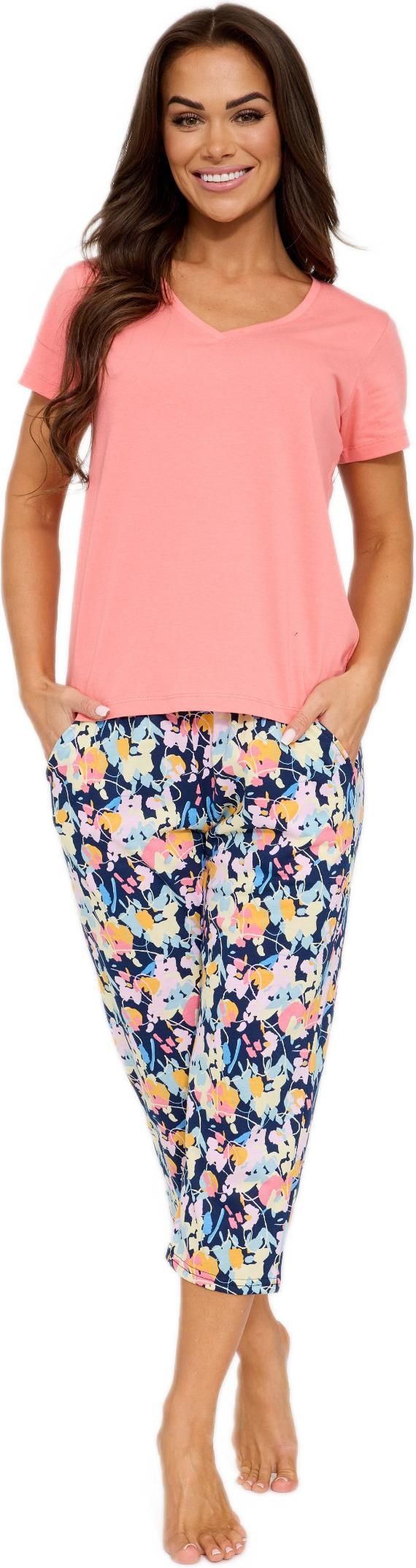 Piżama damska KR 875/338 VIOLETTA marki Cornette to elegancka i wygodna propozycja dla kobiet, które cenią naturalne materiały oraz ponadczasowy styl. Wykonana w 100% z wysokiej jakości bawełny, jest miękka, przewiewna i przyjemna w dotyku, zapewniając maksymalny komfort snu oraz domowego wypoczynku.Jednolita bluzka z krótkim rękawem została zaprojektowana z kobiecym dekoltem w serek, który subtelnie podkreśla sylwetkę i nadaje całości lekkości. W komplecie znajdują się wzorzyste spodnie o długości 7/8, wyposażone w praktyczne kieszenie na biodrach. Elastyczna gumka w pasie obszyta bawełną gwarantuje idealne dopasowanie bez ucisku. To doskonały wybór zarówno na noc, jak i na spokojne poranki w domowym zaciszu.