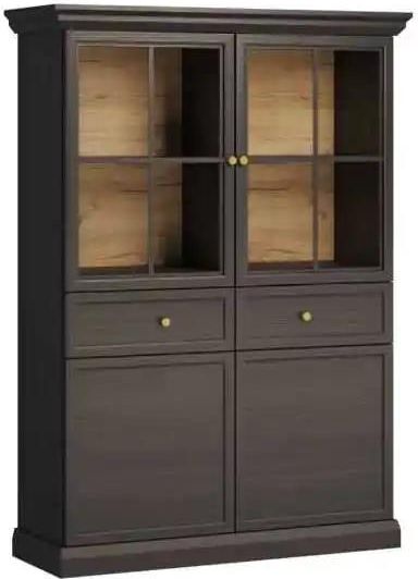 Witryna niska LUCCA W4D2S - czarny Wyjątkowa klasyka, idealna zarówno do salonu, jak i sypialni – czerń z wyraźnymi, naturalnymi porami drewna prezentuje się bardzo elegancko. Styl kolekcji Lucca umożliwia swobodne łączenie elementów klasycznych z nowoczesnymi, a bogato zdobione korony, metalowe uchwyty, w kolorze szlachetnego złota, lustrzane fronty oraz duże, przeszklone witryny będą dumnie zdobić każde wnętrze. O witrynie Elegancka witryna z klasycznym metalowym uchwytem i przeszklonymi frontami, wykonana z bezbarwnego szkła. Wyposażona w listwę z oświetleniem LED o neutralnej barwie, które podkreśla jej nowoczesny design. Masywny cokół o wysokości 86 mm, ozdobne listwy MDF szerokości 35 mm oraz szprosy z MDF o szerokości 15 mm dodają jej elegancji. Ozdobna korona mebla na wysokości 70 mm uzupełnia całość. Wykonana z odpornej na uszkodzenia płyty laminowanej, łączy funkcjonalność z estetyką. Wymiary Szerokość: 118,5 cm Głębokość: 41,5 cm Wysokość: 164,5 cm Dostępny kolor Czarny