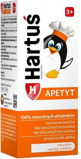 Hartuś Apetyt to preparat, którego składniki mają na celu pobudzać łaknienie, dzięki czemu wspomagają apetyt. Zawiera kompozycję wyciągów ziołowych, które korzystnie wpływają na procesy trawienne organizmu, wspomagają funkcjonowanie żołądka, wątroby i jelit. Wyprodukowany jest w 100% z naturalnych składników. Wyciąg z liści mięty, który wspomaga trawienie, wpływa korzystnie na prawidłowe funkcjonowanie przewodu pokarmowego, w tym żołądka i jelit. Wyciąg z owoców kopru włoskiego, który wspomaga apetyt, trawienie i wydalanie. Wpływa korzystnie na prawidłowe działanie układu pokarmowego, wspomaga funkcje wydalnicze nerek oraz działa detoksykacyjnie na organizm. Wyciąg z mniszka lekarskiego, który wspomaga funkcjonowanie wątroby i pęcherzyka żółciowego, ułatwiając trawienie tłuszczów. Wspomaga działanie żołądka, utrzymując jego pH na właściwym poziomie oraz wpływa korzystnie na prawidłowe funkcjonowanie jelit. Wykazuje właściwości prebiotyczne w przewodzie pokarmowym, pobudza łaknienie, w wyniku czego wspomaga apetyt. Wyciąg z korzenia pietruszki, który wpływa korzystnie na pracę nerek. Wyciąg z kłącza imbiru, który wspomaga trawienie oraz prawidłowe funkcjonowanie układu pokarmowego. Izomaltuloza*, koncentrat soku z cytryny, koncentrat soku z czarnej marchwi, naturalny koncentrat poziomkowy, wyciąg z liści mięty(Mentha x piperita), wyciąg z owoców kopru włoskiego(Foeniculum vulgare), wyciąg z korzenia mniszka lekarskiego(Taraxacum off.), wyciąg z korzenia pietruszki(Petroselinum sativum), wyciąg z kłącza imbiru(Zingiber off.). * izomaltuloza (źródło glukozy i fruktozy) jest naturalnym węglowodanem o mniej słodkim smaku niż tradycyjny cukier. Jest dobrze przyswajalna i dlatego jest odpowiednia dla dzieci. W przeciwieństwie do cukru, izomaltuloza nie jest rozkładana przez bakterie w jamie ustnej, dzięki czemu pomaga w zachowaniu mineralizacji zębów. Spożywanie żywności zawierającej izomaltulozę zamiast cukru prowadzi do mniejszego wzrostu poziomu glukozy we krwi niż po spożyciu żywności zawierającej cukier. 10 ml zawiera: wyciąg z liści mięty 33,4mg, wyciąg z owoców kopru 30,25mg, wyciąg z korzenia mniszka 25mg, wyciąg z korzenia pietruszki 25mg, wyciąg z kłącza imbiru 2,5mg. 1 raz dziennie 10 ml.