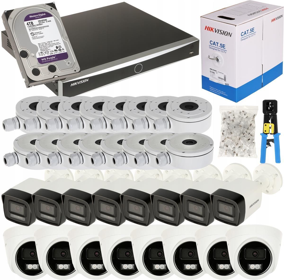 Kompletny zestaw do monitoringu składający się z 16 kamer i rejestratora z zasilaczem PoE. Zestaw składa się z rejestratora, dysku twardego o pojemności 4 TB, 8 kamer tubowych, 8 kamer kulkowych, skrętki komputerowej o długości 305 m, kompletu wtyków RJ45 oraz zaciskarki. Rejestracja odbywa się w standardzie kompresji H.265+, pozwalającym na uzyskanie najlepszej jakości obrazu przy wykorzystaniu minimalnej przepustowości sieci i pojemności dyskowej. Menu zostało zaprojektowane w sposób ułatwiający każdemu, nawet początkującemu użytkownikowi nawigację i wprowadzanie zmian w ustawieniach rejestratora. Rejestrator DS-7616NXI-K2/16P Wbudowany 16-portowy switch PoE: Umożliwia zasilanie kamer bezpośrednio przez kabel sieciowy, upraszczając instalację i eliminując potrzebę dodatkowego okablowania zasilającego. Obsługa kamer do 12 Mpx: Zapewnia wyjątkową jakość nagrań, idealną dla profesjonalnych systemów monitoringu. Zaawansowana kompresja H.265+: Oszczędza miejsce na dysku twardym bez utraty jakości obrazu, umożliwiając dłuższe przechowywanie nagrań. Inteligentne funkcje analizy wideo: Detekcja twarzy, filtrowanie fałszywych alarmów, inteligentna detekcja ruchu z rozróżnieniem ludzi i pojazdów. Wyjścia HDMI 4K i VGA: Umożliwia podłączenie monitorów o wysokiej rozdzielczości do podglądu na żywo. Rejestrator DS-7616NXI-K2/16P to zaawansowane urządzenie stanowiące serce systemu monitoringu. Dzięki wbudowanemu switchowi PoE i obsłudze zaawansowanych funkcji AI, zapewnia niezawodność i skuteczność w zabezpieczaniu obiektu. Kamera tubowa DS-2CD1043G2-LIU(2.8MM)PL (8 szt.) Rozdzielczość 4 Mpx z technologią ColorVu: Zapewnia kolorowy obraz nawet w nocy dzięki oświetlaczowi światła białego o zasięgu 30 m. Inteligentna detekcja ruchu z rozróżnieniem ludzi i pojazdów: Zaawansowane funkcje AI redukują fałszywe alarmy i zwiększają skuteczność systemu. Wbudowany mikrofon: Rejestruje dźwięk, dostarczając dodatkowych informacji o monitorowanym obszarze. Obudowa IP67: Odporna na warunki atmosferyczne, idealna do zastosowań zewnętrznych. Zaawansowane funkcje obrazu: WDR 120 dB, 3D-DNR, BLC/HLC, ROI, zapewniające wysoką jakość obrazu w trudnych warunkach oświetleniowych. Kamera DS-2CD1043G2-LIU(2.8MM)PL to niezawodne urządzenie oferujące wysoką jakość obrazu i zaawansowane funkcje inteligentne, idealne do monitorowania kluczowych obszarów na zewnątrz budynków. Kamera kopułkowa DS-2CD1343G2-LIU(2.8MM)PL (8 szt.) Rozdzielczość 4 Mpx z technologią ColorVu: Gwarantuje kolorowy obraz przez całą dobę dzięki oświetlaczowi światła białego o zasięgu 30 m. Inteligentna detekcja ruchu z rozróżnieniem ludzi i pojazdów: Zwiększa efektywność monitoringu poprzez redukcję fałszywych alarmów. Wbudowany mikrofon: Pozwala na rejestrowanie dźwięku w monitorowanym obszarze. Obudowa IP67: Solidna i odporna na warunki atmosferyczne konstrukcja, idealna do zastosowań wewnętrznych i zewnętrznych. Funkcje zaawansowane: WDR 120 dB, 3D-DNR, BLC/HLC, zapewniające wyraźny i szczegółowy obraz. Kamera DS-2CD1343G2-LIU(2.8MM)PL jest doskonałym wyborem do monitorowania wnętrz oraz obszarów narażonych na zmienne warunki pogodowe, oferując wysoką jakość obrazu i niezawodność. Uchwyt DS-1280ZJ-XS (8 szt.) Przeznaczony dla kamer tubowych Hikvision: Umożliwia stabilny i estetyczny montaż kamer na ścianie lub suficie. Solidna aluminiowa konstrukcja: Odporna na korozję i warunki atmosferyczne, idealna do zastosowań zewnętrznych. Kompaktowy design: Biały kolor i niewielkie wymiary pozwalają na dyskretną instalację. Uchwyt DS-1280ZJ-XS jest niezbędnym elementem zestawu, zapewniającym bezpieczny i trwały montaż kamer tubowych, co przekłada się na optymalną funkcjonalność systemu monitoringu. Uchwyt DS-1280ZJ-S (8 szt.) Przeznaczony dla kamer kopułkowych Hikvision: Ułatwia montaż kamer na różnych powierzchniach, zapewniając optymalne ustawienie. Wytrzymała aluminiowa konstrukcja: Gwarantuje długotrwałe użytkowanie nawet w trudnych warunkach atmosferycznych. Estetyczny wygląd: Biały kolor i elegancki design pasują do większości wnętrz i elewacji. Uchwyt DS-1280ZJ-S umożliwia elastyczne ustawienie kamer kopułkowych, co pozwala na skuteczne monitorowanie wybranych obszarów. Skrętka komputerowa DS-PL-5E (305 m) Kabel UTP kat. 5e wysokiej jakości: Zapewnia niezawodną transmisję danych i zasilanie PoE dla kamer. Spełnia normy ANSI/TIA-568.2-D, IEC61156, ISO/IEC11801: Gwarantuje zgodność z wymaganiami sieciowymi i stabilność połączeń. Długość 305 m: Wystarczająca ilość kabla do podłączenia wszystkich elementów systemu nawet w dużych instalacjach. Skrętka DS-PL-5E jest niezbędnym elementem systemu, umożliwiającym komunikację między rejestratorem, kamerami i innymi urządzeniami. Wysoka jakość kabla zapewnia niezawodność i długotrwałe użytkowanie. Zaciskarka HT-240T i wtyki RJ45T Profesjonalna zaciskarka z funkcjami ściągania izolacji i obcinania: Ułatwia przygotowanie kabli do instalacji, czyniąc proces szybkim i efektywnym. 100 sztuk wtyków RJ-45: Wystarczająca ilość złączy do zakończenia wszystkich kabli oraz na ewentualne potrzeby serwisowe. Prosty i szybki montaż: Pozwala na profesjonalne wykonanie okablowania bez konieczności korzystania z usług specjalistów. Narzędzia i akcesoria do okablowania umożliwiają samodzielne przygotowanie przewodów sieciowych, co przyczynia się do oszczędności i elastyczności podczas instalacji. Dysk twardy HDD-WD43PURZ Pojemność 4 TB: Duża przestrzeń do przechowywania nagrań z monitoringu przez długi czas. Dedykowany do pracy ciągłej 24/7: Zaprojektowany specjalnie do systemów monitoringu wizyjnego, zapewnia niezawodność i długowieczność. Technologia AllFrame 4K™: Ogranicza zjawisko "wypadania" klatek wideo, zapewniając płynne nagrywanie i odtwarzanie. Dysk twardy HDD-WD43PURZ 