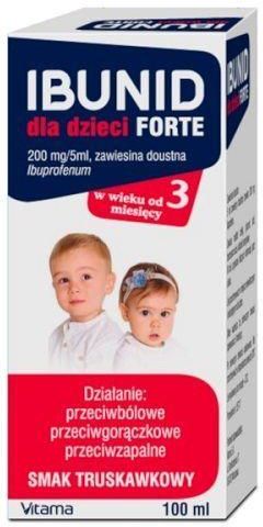 Wskazania do stosowania:- Gorączka różnego pochodzenia (także w przebiegu zakażeń wirusowych, w przebieguodczynu poszczepiennego)- Bóle różnego pochodzenia o nasileniu słabym do umiarkowanego: bóle głowy, gardła imięśni np. w przebiegu zakażeń wirusowych- Bóle mięśni, stawów i kości, na skutek urazów narządu ruchu (nadwerężenia, skręcenia)- Bóle na skutek urazów tkanek miękkich, bóle pooperacyjne: bóle zębów, bóle po zabiegachstomatologicznych, bóle na skutek ząbkowania- Bóle głowy- Bóle uszu występujące w stanach zapalnych ucha środkowego PrzeciwwskazaniaProdukt leczniczy jest przeciwwskazany u pacjentów:- z nadwrażliwością na ibuprofen lun którąkolwiek substancję pomocniczą lub na inneniesteroidowe leki przeciwzapalne (NLPZ)- u których po przyjęciu kwasu acetylosalicylowego lub innych niesteroidowych lekówprzeciwzapalnych (NLPZ) występowały kiedykolwiek w przeszłości objawy alergii w postacikataru, pokrzywki lub astmy oskrzelowej, obrzęku naczynioruchowego- z zaburzeniami krzepnięcia (ibuprofen może przedłużyć czas krwawienia)- z chorobą wrzodową żołądka i (lub) dwunastnicy czynną lub w wywiadzie, lubnawracającymi krwawieniami z przewodu pokarmowego (zdefiniowane jako dwa lub więcejepizodów owrzodzenia lub krwawienia)- z krwawieniem z przewodu pokarmowego i perforacją związanymi z wcześniejszymleczeniem NLPZ- z czynnym krwawieniem oraz zaburzeniami wytwarzania krwi o nieustalonym pochodzeniu(takie jak małopłytkowość)- z ciężką niewydolnością wątroby- z ciężką niewydolnością nerek (indeks kreatyniny poniżej 30 ml/min)- z ciężką niewydolnością serca (klasa IV wg NYHA)- w III trymestrze ciąży- ze skazą krwotoczną- u dzieci w wieku < 3 miesiąca życia- z ciężkim odwodnieniem (wywołanym wymiotami, biegunką, lub niewystarczającymspożyciem płynów)Dawka dobowa produktu leczniczego Ibunid dla dzieci Forte w leczeniu bólu i gorączkiwynosi 20-30 mg/kg masy ciała, podana w dawkach podzielonych według poniższegoschematu:- Niemowlęta w wieku od 3 do 6 miesięcy (5-7,6 kg): 3 razy po 1,25 ml w ciągu doby(co odpowiada 150 mg ibuprofenu/dobę)- Niemowlęta w wieku od 6 do 12 miesięcy (7,7-9 kg): 3 do 4 razy po 1,25 ml w ciągu doby(co odpowiada 150-200 mg ibuprofenu/dobę)- Dzieci w wieku od 1 do 3 lat (10-15 kg): 3 razy po 2,5 ml w ciągu doby(co odpowiada 300 mg ibuprofenu/dobę)- Dzieci w wieku od 4 do 6 lat (16-20 kg): 3 razy po 3,75 ml w ciągu doby(co odpowiada 450 mg ibuprofenu/dobę)- Dzieci w wieku od 7 do 9 lat (21-29 kg): 3 razy po 5 ml w ciągu doby(co odpowiada 600 mg ibuprofenu/dobę)- Dzieci w wieku od 10 do 12 lat (30-40 kg): 3 razy po 7,5 ml w ciągu doby (co odpowiada900 mg ibuprofenu/dobę)- Dorośli i dzieci w wieku powyżej 12 lat: dawką rekomendowaną w objawowym leczeniubólu i gorączki jest 3 razy po 10 ml w ciągu doby (co odpowiada 1200 mg ibuprofenu/dobę)do ustąpienia objawów- Pacjenci w podeszłym wieku: dawkowanie powinno być ustalone indywidualnie przezlekarza.
