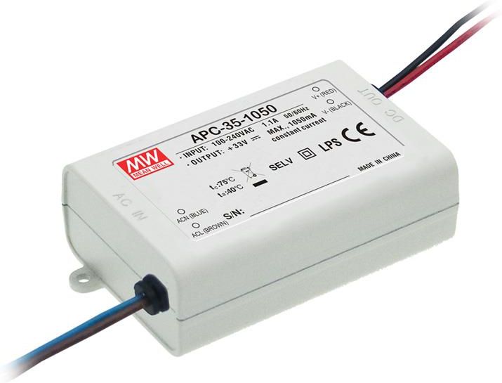 APC-35-700 Zasilacz LED 35W 15~50V 0.7A Zasilacz APC-35-700 to model produkowany przez firmę MEAN WELL, który należy do serii APC, specjalizującej się w dostarczaniu energii do urządzeń wymagających napięcia stałego. Zasilacz ten charakteryzuje się kompaktową budową, wysoką efektywnością energetyczną oraz niezawodnością, dzięki czemu jest wykorzystywany w wielu zastosowaniach przemysłowych, oświetleniowych i elektronicznych. Dzięki swojej specyfikacji oraz funkcjom ochronnym, APC-35-700 jest idealnym rozwiązaniem w przypadku, gdy potrzebujesz zasilania LED, systemów sterowania, a także wielu innych aplikacji wymagających stabilnego napięcia. Zasilacz APC-35-700 oferuje wysoką sprawność, wynoszącą do 89%, co pozwala na minimalizację strat ciepła i oszczędności energii. Dzięki temu zasilacz działa w sposób bardziej efektywny, co przekłada się na długotrwałą, bezawaryjną eksploatację i mniejsze zużycie energii. Główne cechy zasilacza APC Zasilacz o stałym prądzie Uniwersalne wejście AC/pełny zakres Wytrzymuje skok napięcia wejściowego 300 V AC przez 5 sekund Zabezpieczenia: Zwarcie / Przepięcie Całkowicie izolowana obudowa plastikowa Mały i kompaktowy rozmiar Chłodzenie poprzez swobodną konwekcję powietrza Konstrukcja IP42 Test wypalania przy 100% pełnym obciążeniu Nadaje się do urządzeń lub opraw LED (takie jak urządzenia dekoracyjne lub reklamowe LED) (Uwaga 6) Niskie koszty/wysoka niezawodność Pecyfikacja zasilacza APC-35-700 Napięcie wyjściowe: 15~50V Moc wyjściowa: 35W MAX prąd na wyjściu: 0.7A Stopień wodoodporności: IP42 Napięcie wejściowe: 90~ 264VAC Temperatura pracy: -30~ + 70C Ochrona przeciw przeciążeniowe: Tak (Hiccup) Ochrona przeciwprzepięciowa: Tak (Hold & Restart) Certyfikaty bezpieczeństwa: UL8750 (only for APC-35-700&1050), CSA-C22.2 No. 250.0-13 (only for APC-35-1050), BIS IS15885(only for APC-35-700&1050), EAC TP TC 004,IP42, BS EN/EN 62368-1 approved Model: APC-35-700 Wymiary: 84 x 57 x 29.5 mm Waga: 180g