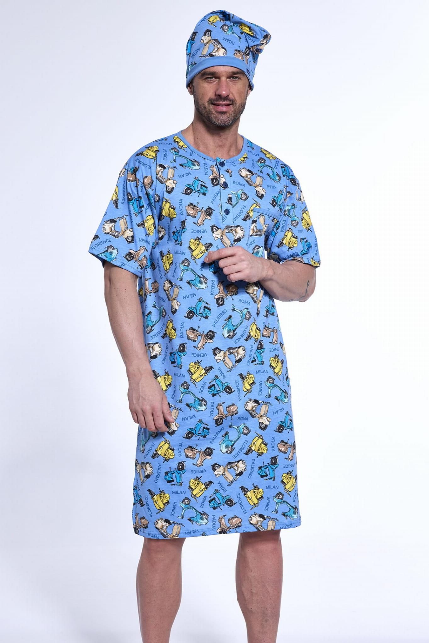 Męska koszula nocna Cornette 109/32 [Rozmiar 2XL] 5902458259793 Męska koszula nocna z krótkim rękawem ze szlafmycą Cornette 109/32. Koszula nocna na zdjęciu wykonana jest z miękkiej dzianiny w skutery oraz napisy z nazwami miast ełoskich. Dominują tutaj odcienie niebieskiego, alenie tylko. Koszula …