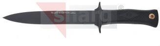 SCORPION-19N nóż ze stałą klingą hiszpańskiej firmy Muela. Solidny, uniwersalny nóż z serii SCORPIONktóry polubisz od pierwszego spojrzenia. Wszechstronny z masywną klingą zniesie bez uszczerbku każdą pracę w każdych warunkach. Doskonały na biwak sprawdzi się jako nóż taktyczny, survivalowy, dla myśliwego, EDC. Głownia- ze zbroczem i fałszywym ostrzem o profilu Spear Point, grubości 4.5 mm, pokryta czarną, odporną na zarysowania, matową nierefleksyjnapowłoką PTFE. Wytworzona ze stali nierdzewnej 420H o podwyższonej zawartości węgla i wysokiej udarowości, utwardzanej w przedziale 54-58 HRC. Szlif wklęsły (Hollow Grind), ostrze gładkie typu Plain. U nasady głowni obustronny jelec zabezpiecza przed ześlizgiwaniem się dłoni na ostrze. Rękojeść - pokryta elastyczną moletowaną okładziną z elastomeru w kolorze czarnym. Miękka rękojeść z gumy gwarantuje bardzo dobrą przyczepność, nóż nie wyślizguje się z dłoni, a mocny i pewny chwyt pozwala na wykonywanie precyzyjnych ruchów nożem mimo swoich rozmiarów. W tylnej części rękojeści znajduję się powiększony otwór na linkę. Etui - w kolorze czarnym. Wykonane z naturalnej skóry, zapinane na zatrzask umożliwia bezpieczne przenoszenie noża. Brzegi pochwy przeszyto ozdobną nicią. Na froncie tłoczone logo producenta. Pochwa posiada mocowanie do pasa lub oporządzenia umożliwiające noszenie noża w pozycji pionowej. Dane techniczne: Numer produktu: SCORPION-19N Rodzaj stali: 420H Długość głowni: 190 mm / 7.48" Grubość głowni: 4.5 mm / 0.18" Długość całkowita: 320 mm / 12.60" Waga: 356 g / 12.56 oz Rodzaj krawędzi tnącej: Plain Typ głowni: Spear Point Rodzaj szlifu: Wklęsły Materiał rękojeści: Termorun Pochwa: Skóra Producent: Muela, Hiszpania Opracowanie: firma Sharg® bezpośredni importer