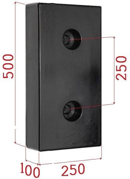 Odboje gumowe do ramp przeładunkowych Szerokość: 250 mm Wysokość: 500 mm Grubość: 100 mm Rozstaw otworów montażowych: 250 mm Otwór na śrubę: Ø22 mm Otwór pod podkładkę: Ø60 mm Wgłębienie na nakrętkę: 60 mm Twardość: 62° Shore’a