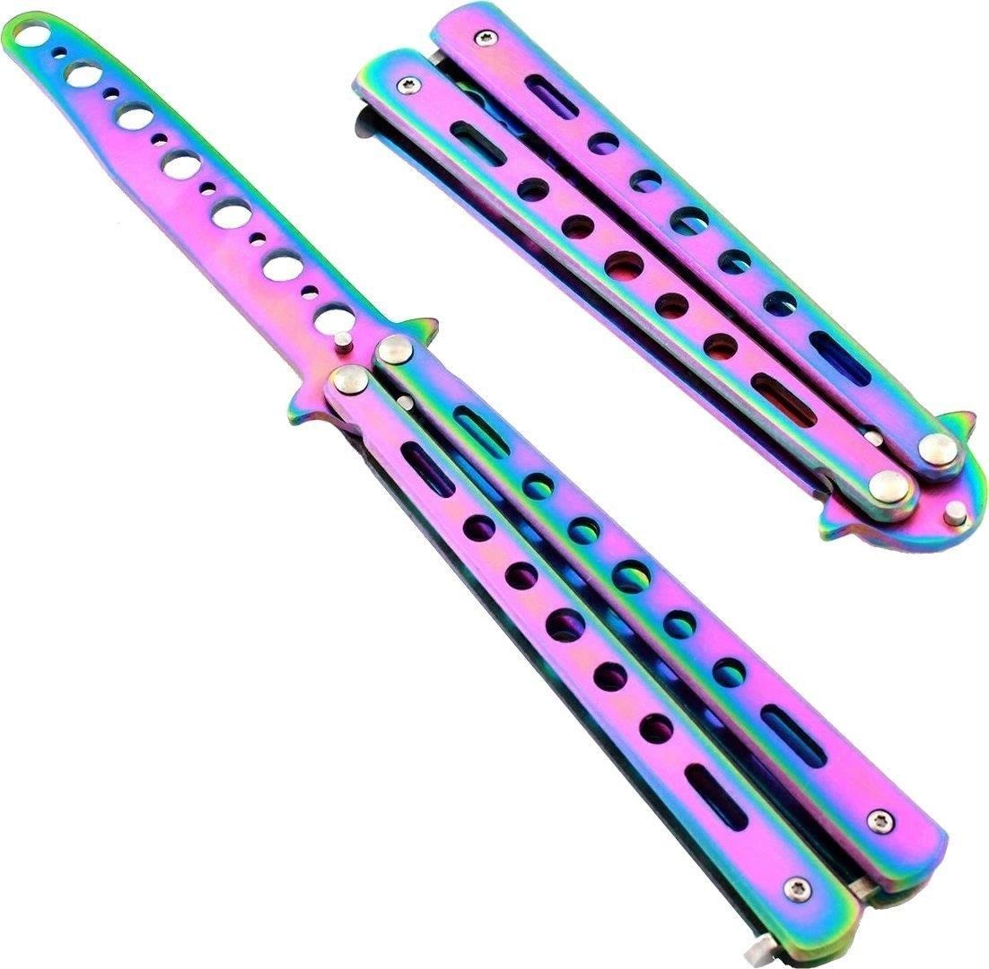 Możesz doskonalić swoje umiejętności posługiwania się motylkiem, ćwicząc triki. Całkowicie bezpiecznym narzędziem, z tępym ostrzem. Posiada wbudowaną blokadę przed otwarciem. Łatwy w składaniu. Blokada Specyfikacja: Długość ostrza: 10 cm Szerokość ostrza: ok 1,9 cm Długość uchwytu: 12 cm Kolor: multicolor Rękojeść: metalowa
