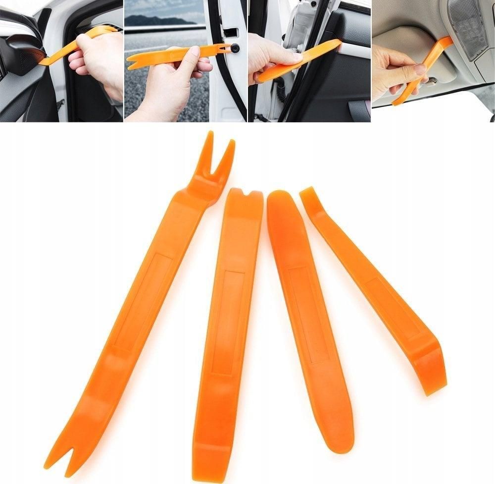 Ściągacze zestaw naprawczy do tapicerki 4 szt. ŚCIĄGACZE OTWIERAKI DŹWIGNIE DO TAPICERKI KLUCZE 4 Zestaw 4 łyżek do rozbierania tapicerki samochodowej, idealne również do otwierania sprzętu elektronicznego na zatrzaski np. pilotów do TV itp. Absolutnie nie pozostawia śladów otwierania. Dzięki tym ściągaczom rozbierzesz każdy element tapicerki nie uszkadzając jej przy tym. Otwieraki wykonane z mocnego tworzywa (o różnej grubości i giętkości), dzięki nim nie wyszczerbisz rantów tapicerki podczas jej podważania. Specyfikacja towaru Otwieraki wykonane z mocnego tworzywa (o różnej grubości i giętkości), dzięki nim nie wyszczerbisz rantów tapicerki podczas jej podważania. Za ich pomocą można również wyciągnąć licznik lub radio. Rozmiary: na zdjęciu obok (165mm, 140mm, 225mm, 190mm) Opakowanie: blister Kolor: pomarańczowy Zestaw 4 łyżek do rozbierania tapicerki samochodowej, idealne również do otwierania sprzętu elektronicznego na zatrzaski np. pilotów do TV itp. Absolutnie nie pozostawia śladów otwierania.