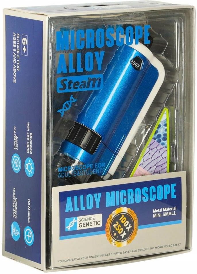 Parametry techniczne Tworzywo: aluminium Kolor niebieski Wiek: 6+ Zasilanie: 1x bateria AAA (brak w zestawie) Powiększenia: 100 X, 250X Regulacja ogniskowej Wymiary mikroskopu: 11,5 cm x 5 cm Wymiary opakowania: 17 cm x 12 cm x 5,8 cm Rodzaj opakowania: karton z plastikowym okienkiem Zawartość zestawu Mikroskop Pokrowiec Smycz Powiększenie aż do 250x! Mikroskop oferuje powiększenie aż do 250x, co pozwala na szczegółowe obserwacje mikroświata! Idealny dla młodych odkrywców, którzy chcą poznać świat z bliska i zobaczyć to, co na co dzień jest niewidoczne gołym okiem. Wygodne, kieszonkowe wymiary Dzięki wymiarom 11,3 cm x 4,9 cm mikroskop jest lekki i poręczny, co sprawia, że można go zabrać wszędzie – do szkoły, parku czy na wycieczkę. Zawsze jest pod ręką, gdy zajdzie potrzeba zbadania czegoś z bliska. Praktyczny zestaw z akcesoriami W zestawie znajduje się ochronny pokrowiec, który zabezpiecza mikroskop przed zarysowaniami i uszkodzeniami, gdy nie jest używany.1x Bateria AAA gratis!!!