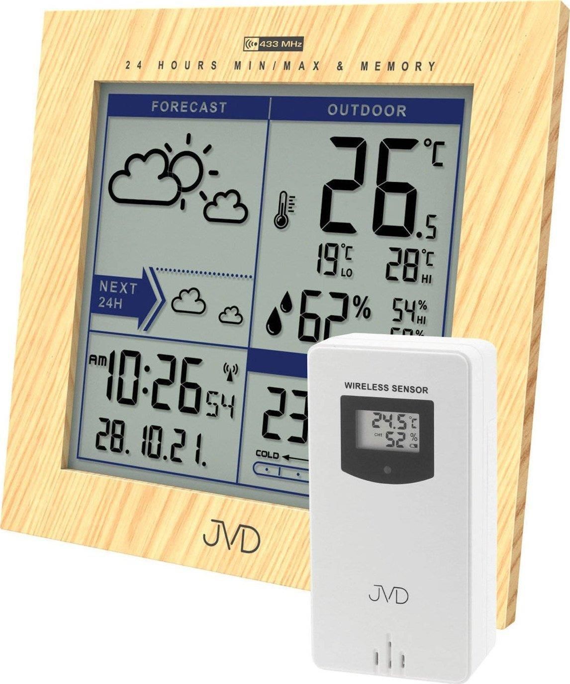 TOWARY NA NASZYCH AUKCJACH SĄ NOWE I NIEUŻYWANE NA TEJ AUKCJI OFERUJEMY Stacja pogody JVD RB9233.1 pamięć Marka / producent: JVD Model: RB9233.1 Czytelna stacja pogody JVD RB9233.1. Prognoza pogody - 5 ikon. Termometr, higrometr. Alarmy temperatur. Pamięć temperatury i wilgotności. Wskaźnik komfortu. Budzik. Zegar sterowany radiowo. Obudowa imitująca drewno ZEGARY - KSZTAŁT: kwadratowy ZEGARY - MATERIAŁ: tworzywo sztuczne ZEGARY - MECHANIZM: kwarcowy, sterowany radiowo ZEGARY - RODZAJ: elektroniczny ZEGARY - TYP: stojący, wiszący ROZMIAR (tylko ścienne): mały - do 27 cm Z KALENDARZEM: kalendarz POMIARY: temperatura, wilgotność, prognoza pogody ILOŚĆ ALARMÓW: 1 BUDZIK / ALARM: z powtarzaniem budzenia ZASILANIE: bateryjne OPIS SZCZEGÓŁOWY PROGNOZOWANIE POGODY za pomocą czujnika barometrycznego prognoza na najbliższe 24 godziny WSKAZANIA POGODY (IKONY) słonecznie częściowe zachmurzenie pochmurnie deszczowo śnieg POMIAR WILGOTNOŚCI ZEWNĘTRZNEJ I WEWNĘTRZNEJ zakres pomiaru od 20 do 99% jednostka pomiaru 1% POMIAR TEMPERATURY ZEWNĘTRZNEJ I WEWNĘTRZNEJ zakres pomiaru temperatury wewnętrznej od -9,9 do +50 stopni C zakres pomiaru temperatury zewnętrznej od -40 do +70 stopni C jednostka pomiaru 0,1 stopnia C ALARMY TEMPERATUR ZEWNĘTRZNYCH możliwość ustawienia alarmu dla zadanych skrajnych temperatur OSTRZEŻENIE O OBLODZENIU migająca ikona pojawiająca się gdy temperatura zewnętrzna jest w zakresie od -2 do +3 stopnie C PAMIĘĆ TEMPERATURY I WILGOTNOŚCI wyświetlanie najniższych i najwyższych zarejestrowanych wartości z sondy zewnętrznej w ciągu ostatnich 24 godzin pamięć najwyższych i najniższych zarejestrowanych wartości z sondy zewnętrznej od ostatniego ich zresetowania; wraz z datą i godziną pomiaru WSKAŹNIK KOMFORTU CZUJNIK (SONDA) ZEWNĘTRZNA Z WYŚWIETLACZEM częstotliwość transmisji 433,92 MHz zasięg do 100 metrów (w otwartej przestrzeni) otwór do powieszenia na ścianie, podstawka zasilanie - 2 baterie LR6 (AA) wymiary 7 cm x 10,5 cm x 3 cm [szer x wys x gł] ZEGAR I KALENDARZ sterowany radiowo (Radio Controlled) - synchronizacja falami radiowymi z wzorcem zegara atomowego z nadajnika umieszczonego w Europie, DCF77 wyświetlanie godziny w formacie 12 lub 24-godzinnym kalendarz automatyczny uwzględniający lata przestępne zamiast sekund może być wyświetlany skrót nazwy dnia tygodnia ALARM / BUDZIK alarm codzienny z funkcją drzemki (snooze) narastający dźwięk alarmu WSKAŹNIK SŁABYCH BATERII SONDY ZEWNĘTRZNEJ STACJA BAZOWA obudowa - tworzywo sztuczne w kolorze jasnobrązowym, struktura drewna montaż - rozkładana podstawka, otwór do powieszenia na ścianie zasilanie - 3 baterie LR03 (AAA) wymiary 10,7 cm x 10,5 cm x 2,2 cm [szer x wys x gł] CAŁY ZESTAW ZAWIERA stację bazową sondę zewnętrzną wyczerpującą instrukcję obsługi PO POLSKU oryginalne opakowanie Każdy sprzedawany produkt jest w fabrycznym opakowaniu producenta