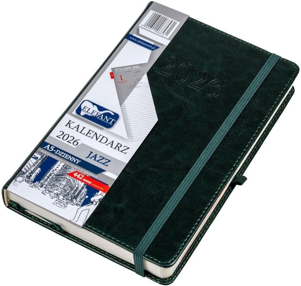 Jazz Kalendarz A5 dzienny zielony 2026 • Jazz: kalendarz książkowy 2026 • format: A5• oprawa: twarda wykonana z wysokiej jakości materiału imitującego skórę• kolor: zielony• oprawa przeszyta delikatną nicią w kolorze zielonym• zamykany na gumkę w kolorze zielonym• gumka na długopis w kolorze …