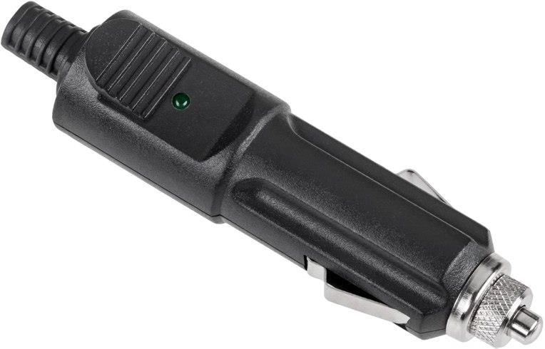Wtyk zapalniczki sam.z diodą+bezp. Na kabel, plastik, z odgietką, bezpiecznik 20mm, dioda świecąca zielonaMin. zamówienie: 10szt.