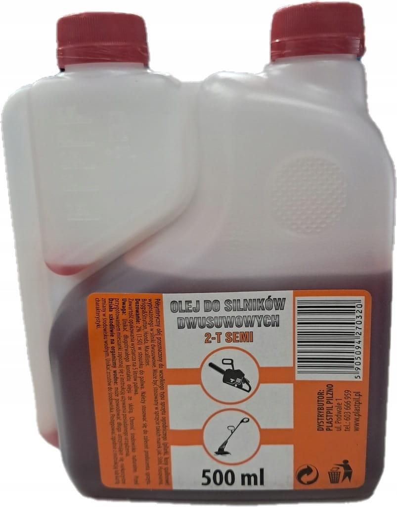 Olej do Silników Dwusuwowych 1:50 z Dozownikiem 500 ml – Ochrona i Wydajność Olej do silników dwusuwowych 1:50 – 500 ml z dozownikiem to niezawodny produkt stworzony z myślą o ochronie i wydajności Twojego sprzętu ogrodniczego, motorowego i budowlanego. Idealny do stosowania w takich urządzeniach jak pilarki, kosy spalinowe, kosiarki, skutery czy motocykle z silnikiem 2T.Dzięki precyzyjnej proporcji 1:50 (1 część oleju na 50 części paliwa) oraz wbudowanemu dozownikowi, dozowanie jest wyjątkowo łatwe i szybkie – bez marnowania produktu.Zalety produktu:• Do silników dwusuwowych – idealny do pilarek, kos, motocykli, skuterów• Optymalne smarowanie – zmniejsza tarcie i zużycie silnika• Chroni przed korozją, nagarem i przegrzewaniem• Wydajna formuła – przedłuża żywotność sprzętu• Wygodna butelka z dozownikiem – precyzyjne odmierzanie• Opakowanie 500 ml – wystarcza na wiele użyćSpełnia wysokie normy jakościowe i jest rekomendowany przez producentów urządzeń spalinowych. Regularne stosowanie tego oleju zwiększa bezpieczeństwo pracy i pozwala cieszyć się bezawaryjną eksploatacją przez długi czas.Zadbaj o swój sprzęt – wybierz olej, który zapewnia maksymalną ochronę i wydajność Twojego silnika!