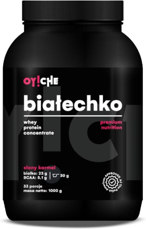 OY!CHE Białechko Słony karmel – białko, które smakuje i działaSięgnij po OY!CHE BIAŁECHKO, wysokiej jakości odżywkę białkową WPC dostępną w czterech smakach: wanilia, truskawka, słony karmel i czekolada. To idealny wybór, jeśli chcesz wspierać regenerację mięśni, budować masę lub uzupełniać dietę w pełnowartościowe białko.Dlaczego warto?Pełnowartościowe białko z kompletem aminokwasów, w tym BCAA.Doskonały smak, który sprawia, że suplementacja to przyjemność.Wybór trzech rozmiarów opakowań: 600 g