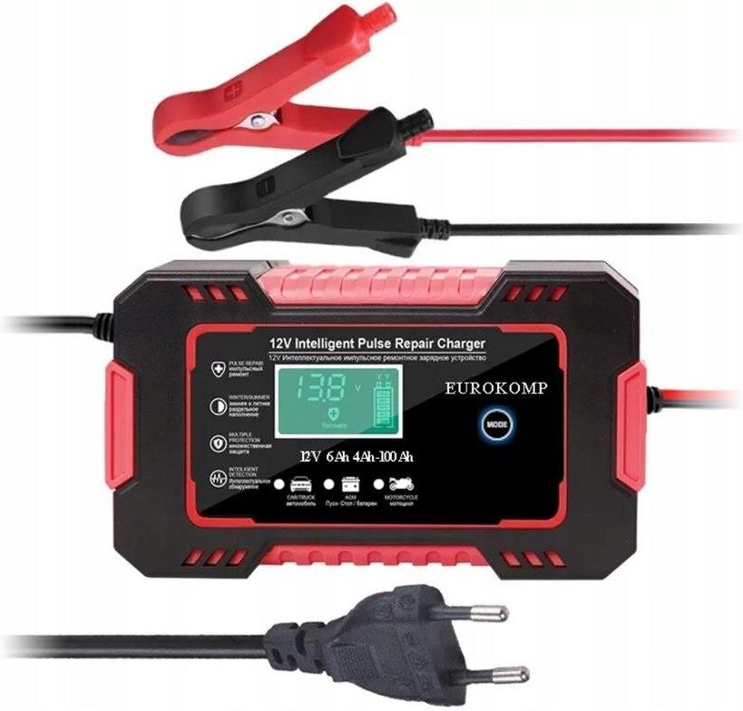 Prostownik automatyczny 12 V 6A E6165 ? Wysokiej jakości prostownik automatyczny mikroprocesorowy marki EUROKOMP, pozwalający na ładowanie akumulatorów instalowanych m.in. w: samochodach osobowych, motocyklach, łodziach. ? WYSOKA JAKOŚĆ Ładowarka LTC wykonana została z wysokiej jakości materiałów, dzięki czemu cechuje się trwałością i długowiecznością. Zastosowane zabezpieczenia prądowe i termiczne zwiększają bezpieczeństwo korzystania z ładowarki, a funkcja regeneracji akumulatora pozwala na wydłużenie jego żywotności. ? TRYB LETNI I ZIMOWY W przypadku, gdy prostownik wykrywa temperaturę: powyżej 28°C - uaktywnia się tryb letni, poniżej 10°C - uaktywnia się tryb zimowy. W zależności od wykrytej temperatury na ekranie podświetli się adekwatna ikonka i prostownik optymalnie naładuje podłączony pojazd/urządzenie. ? WIELOFUNKCYJNY WYŚWIETLACZ LCD Czytelny wyświetlacz LCD dostarcza użytkownikowi wszelkich informacji na temat procesu ładowania, m. in: wyświetlenie napięcia wyświetlenie natężenia wyświetlenie temperatury wyświetlenie statusu regeneracji akumulatora wyświetlenie powiadomienia o zakończeniu pracy ? PRZYCISK DO ZMIANY TRYBU Prostownik wyposażony jest w przycisk do zmiany trybów ładowania, dzięki któremu jednym dotknięciem ustawisz preferowaną opcję: ładowanie samochodu ładowanie akumulatora ładowanie motocyklu tryb regeneracji akumulatora ? ŁADOWARKĘ MOŻNA STOSOWAĆ DO: samochodów osobowych, czterokołowców motocykli kosiarek skuterów śnieżnych oraz wodnych łodzi wózków widłowych traktorów WIĘC DO URZĄDZEŃ/POJAZDÓW KORZYSTAJĄCYCH Z: Akumulatorów AGM Akumulatorów żelowych Akumulatorów kwasowo-ołowiowych (SLA) Akumulatorów z ciekłym elektrolitem ? BEZPIECZEŃSTWO UŻYTKOWANIA Prostownik został wyposażony w inteligentny czip, który w razie powstania niepożądanych sytuacji mogących skutkować niebezpieczeństwem i zagrożeniem zdrowia i życia odcina moc. Procesor chroni przed: krótkim spięciem, przetężeniem, przegrzaniem, ogniem, zbyt małym napięciem, zbyt dużym napięciem, odwrotnym podłączeniem kabli porażeniem ? CECHY PRODUKTU Sterowanie mikroprocesorem, inteligentna charakterystyka ładowania Podświetlany wyświetlacz LCD Stabilne utrzymanie funkcji ładowania Funkcja diagnostyki akumulatora Zabezpieczenie przeciwzwarciowe Ochrona przed odwróceniem biegunowości Ochrona przed przegrzaniem Izolowane zaciski, tzw. krokodylki Ochrona przed brudem, kurzem i wilgocią DANE TECHNICZNE: Model produktu: E6165 Producent: EUROKOMP Rozmiar produktu: 150 x 85 x 62 mm. Waga netto: 400 g. Długość kabla wyjściowego: 65 cm, Długość kabla wejściowego: 90 cm. Napięcie wejściowe: AC 110 - 220 V (50 - 60 Hz). Napięcie wyjściowe: DC 13,8 - 15,5 V. Prąd wyjściowy: 6 A (maks.). Moc maksymalna: 100 W Rodzaje akumulatorów: samochodowe / motocyklowe / AGM