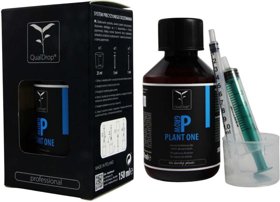 P GROW – NAWÓZ FOSFOROWY DLA ROŚLIN WODNYCH ZASTOSOWANIE P GROW ONE to preparat dostarczający fosfor. Fosfor jest nie tylko niezbędnym składnikiem szeregu związków organicznych oraz wielu enzymów. Dodatkowo za pośrednictwem wysokoenergetycznych związków fosforanowych typu ADP lub ATP jest głównym przenośnikiem i akumulatorem energii w procesach biochemicznych zachodzących w roślinach. P GROW zawiera dodatkowo składniki zwiększające przyswajalność i wykorzystanie makro i mikro elementów. P GROW ONE jest szczególnie polecany do zbiorników z aktywnym podłożem i systemem dozowania CO2. DAWKOWANIE 1 ml P GROW ONE na 100 l wody podnosi stężenie PO4 do ok. 0,1 mg/l. P GROW ONE w nieznaczącym stopniu podnosi stężenie potasu w akwarium. Przy stężeniu PO4 0,1 mg/l o około 0,03-0,04 mg/l. Optymalne dawki i docelowe stężenie fosforu należy dobrać indywidualnie do każdego akwarium, biorąc pod uwagę ilość i gatunki roślin, oświetlenie, rodzaj podłoża, twardość wody, stężenie CO2 oraz stężenia innych składników pokarmowych roślin takich jak azot czy potas. W przypadku przedawkowania należy natychmiast podmienić część wody w akwarium. Rekomendujemy używanie P GROW razem z innymi preparatami z serii PLANT ONE. Poniżej udostępniamy kalkulator, który ułatwia dokonanie ewentualnej korekty stężenia fosforu w postaci fosforanów (PO4) lub przygotowywanej wodzie do podmian. Oblicza ilość ml preparatu P Grow, w zależności od stężenia jonów fosforanowych (PO4), jakie ma być docelowo w zbiorniku. W kalkulatorze należy podać: Ilość netto wody w zbiorniku – jest to ilość „netto” wody w zbiorniku (nie pojemność nominalna zbiornika) czyli bez podłoża, dekoracji, kamieni. "Plus" oczywiście z wodą np. w systemie filtracji i ewentualnie "reaktorach" CO2. Obecne stężenie PO4 [mg/l] – jest to obecne znane stężenie PO4 w zbiorniku, w mg/l Planowane stężenie PO4 [mg/l] – jest to planowane, czyli takie, jakie chcemy osiągnąć w zbiorniku, w mg/l UWAGA! Chronić przed dziećmi. W razie konieczności zasięgnięcia porady lekarza, należy pokazać pojemnik lub etykietę. Przed użyciem przeczytać etykietę. Dokładnie umyć ręce po użyciu. Nie stosować do hodowli roślin i zwierząt przeznaczonych do konsumpcji i przetwórstwa spożywczego. Preparat przeznaczony do akwariów z krewetkami, rybami i roślinami ozdobnymi. Preparat przechowywać szczelnie zamknięty w temperatur