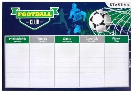 Plan lekcji jest niezbędnym elementem wyposażenia szkolnej wyprawki.Plan z kolekcji Starpak z grafiką nawiązującą do piłki nożnej zawiera podział na pięć dni tygodnia z 8 wierszami do wpisu, dzięki czemu żaden uczeń nie zapomni o potrzebnych mu danego dnia książkach czy zeszytach. Grafika z piłką nożną sprawi, że każdy dzień w szkole będzie dobrze zaplanowany i udany. Wymiary: 15.5 x 22.5 cm
