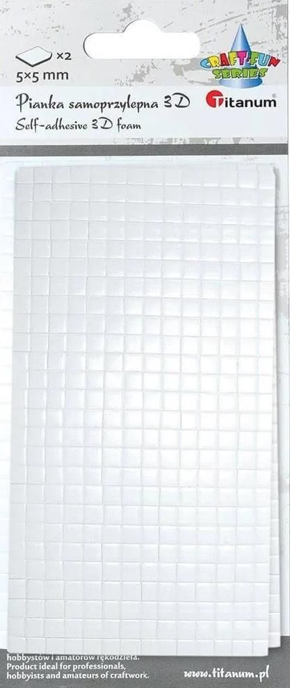 PIANKA SAMOPRZYLEPNA 3D KWADRATY 5MM/5MM Kostki taśmy samoprzylepnej. Rozmiar kostki 5 x 5 mm. 728 kostek na 2 arkuszach. Ułatwiają mocowanie niewielkich elementów dekoracyjnych zarówno papierowych jak i z innych tworzyw, np. kryształków, kwiatków, motylków. Idealne przy tworzeniu kartek lub zaproszeń okolicznościowych, bardzo przydatne w technice scrapbookingu i cardmakingu. Proste w użyciu, pozwalają na uzyskanie efektu 3D
