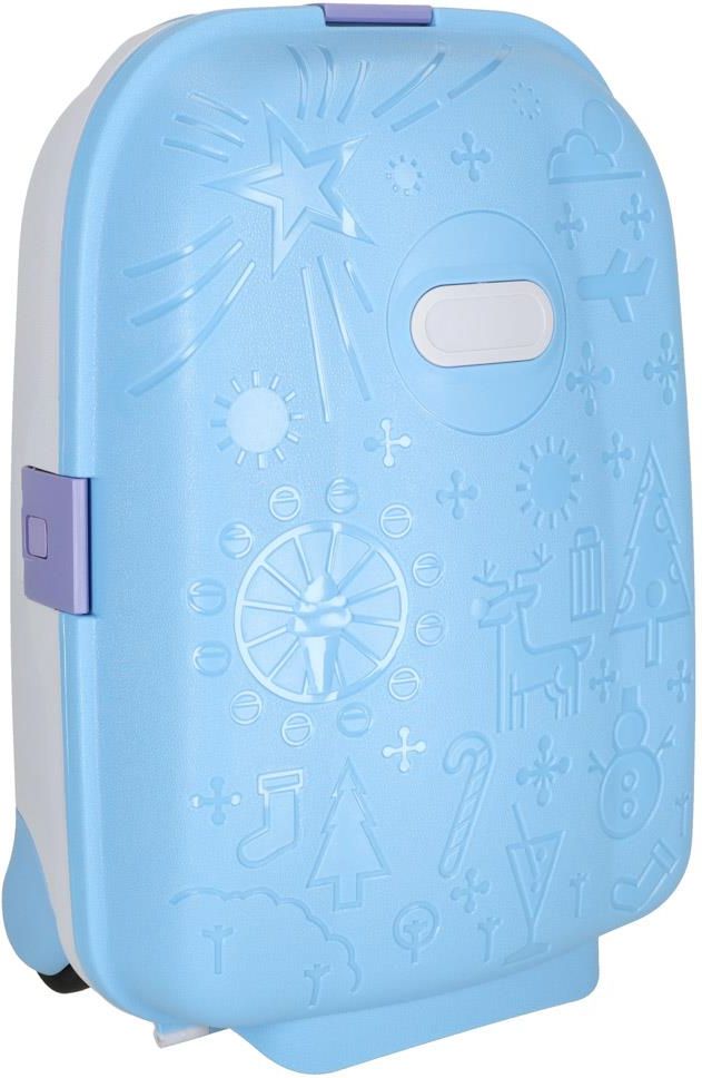 Walizka podróżna dla dzieci na kółkach bagaż podręczny niebieski Duża pojemność - dzięki dwóm dużym przegrodom, bez problemu pomieści wszystkie dziecięce rzeczy Wygoda użytkowania - za sprawą dwóch kółek i wysuwanej rączki prowadzenie walizki jest niezwykle wygodne Doskonała jakość - materiały użyte do stworzenia walizki są doskonałej jakości, aby maluch mógł jej używać podczas wielu podróży Własna walizka to idealne rozwiązanie dla każdego małego podróżnika gotowego na nowe przygody! Niebieski kolor i ciekawe wzorki przykują uwagę dziecka, a może i nawet zachęcą do samodzielnego spakowania się. Cała konstrukcja walizki została wykonana z trwałych i solidnych materiałów, zapewniających niezawodność nawet podczas najbardziej ekscytujących przygód. Wnętrze walizki podzielone jest na dwie pojemne komory. Dodatkowo walizka wyposażona jest w dwa kółka oraz wysuwaną rączkę dla wygodnego korzystania. Produkt zapakowany w kartonowe opakowanie. Parametry techniczne Kolor: niebieski Tworzywo: plastik Wymiary walizki (z uchwytem i kółkami): 43 cm x 30 cm x 19 cm Średnica kółek: 7 cm Wysokość rączki od ziemi: 84 cm Zawartość zestawu Walizka Naklejki